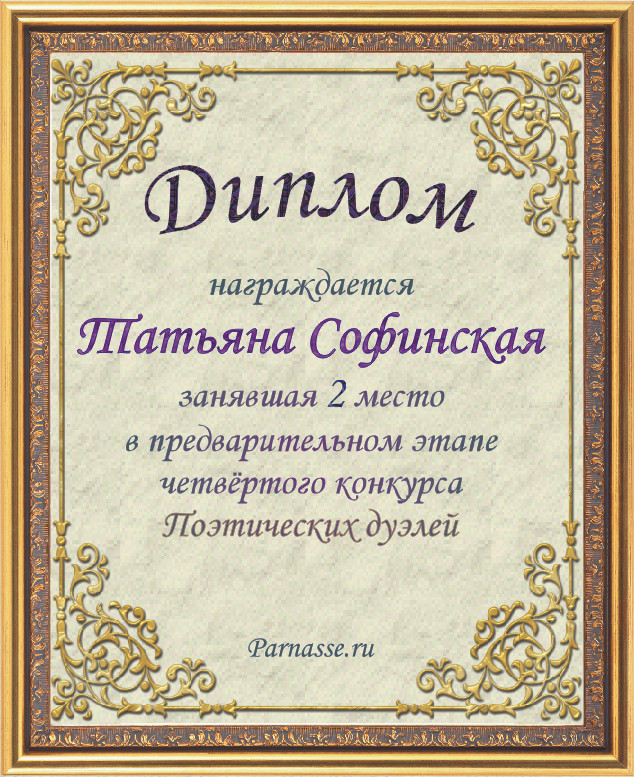 Диплом за победу в номинации "Лучшая дуэль" в четвёртом конкурсе поэтических дуэлей