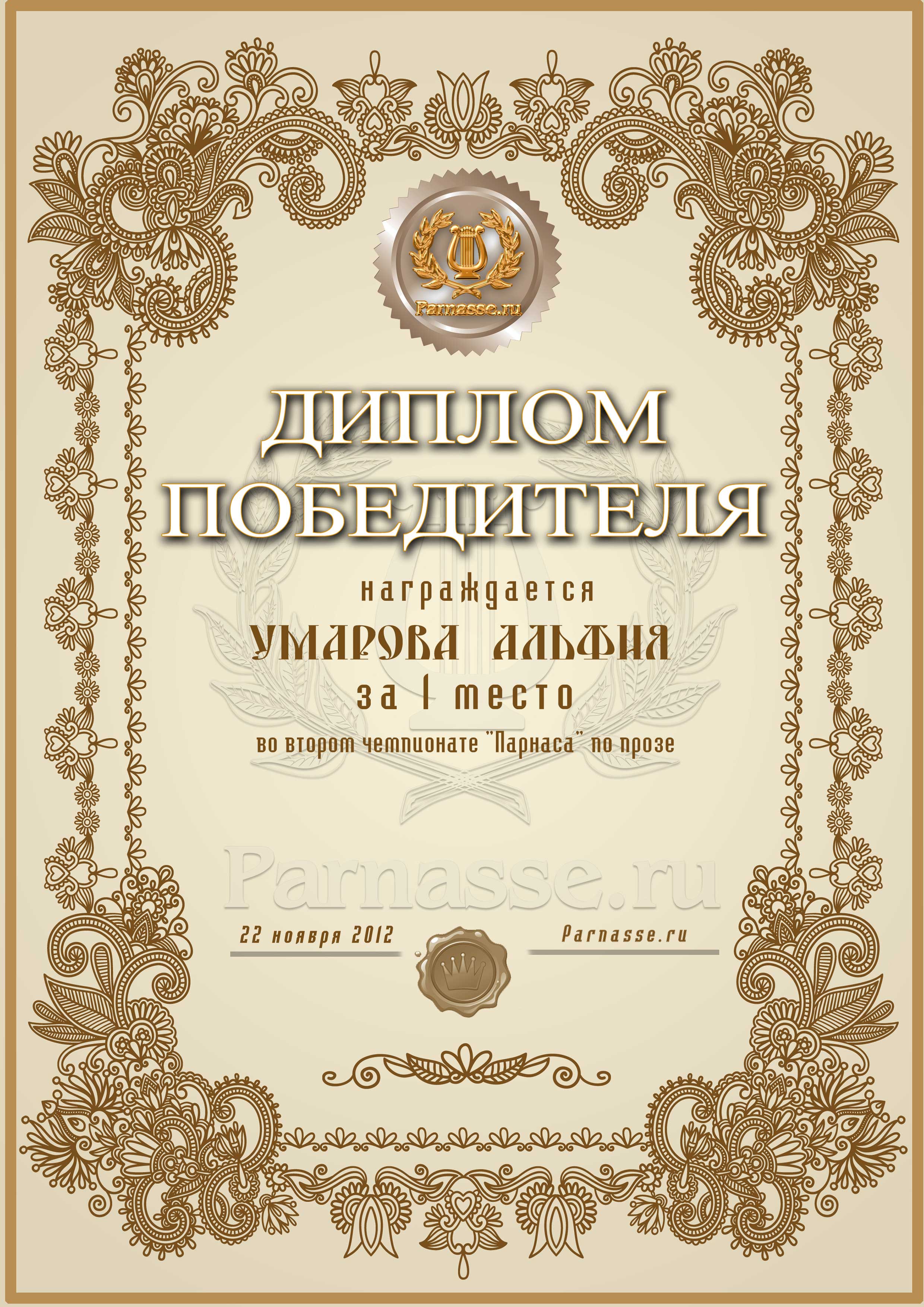 За ПЕРВОЕ место во втором Чемпионате Парнаса по прозе! Поздравляем! Спасибо за активное участие на Чемпионате!