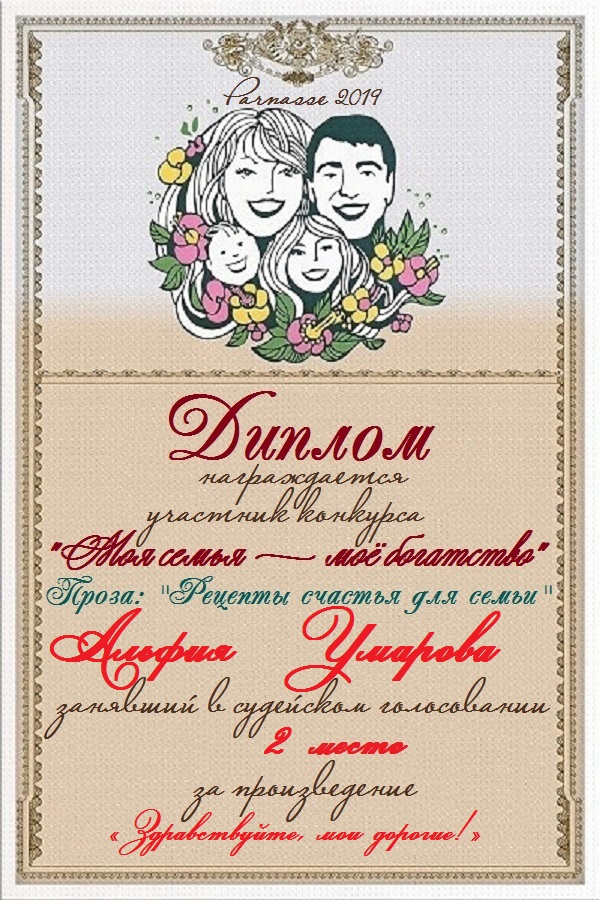 ВТОРОЕ место в музыкально – литературном конкурсе «День Семьи, Любви и Верности!». Номинация «Самый нежный рассказ о Семье, Любви и Верности!». Произведение "Здравствуйте, мои дорогие!". Поздравляем!