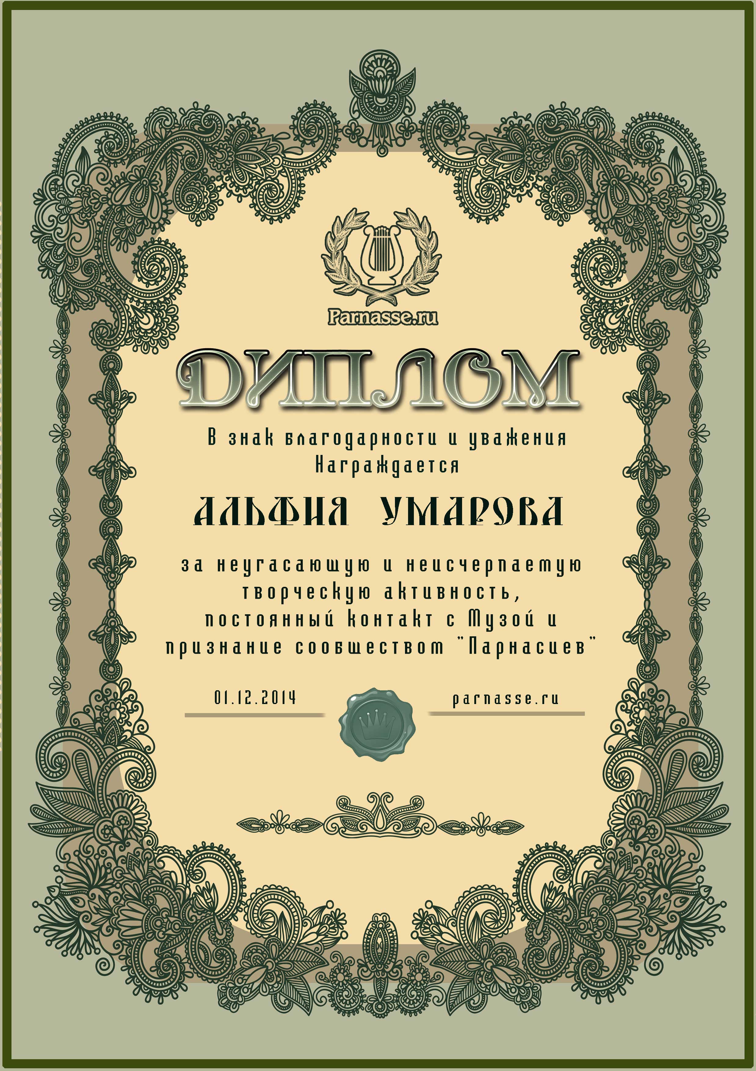 За прекрасное поздравление с Днём Рождения Парнаса! Очень-очень понравилось! БРА-ВО! Благодаря Вам, Альфия, наш общий праздник получился очень ярким, красивым и выразительным! С восхищением, Администрация! Со вторым Днём Рождения Парнаса!
