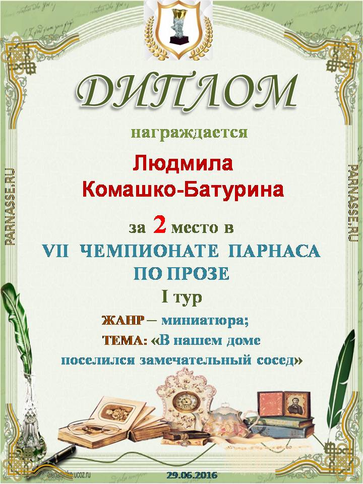 Диплом за 2 место "Полёт № 16", номинация - проза. Желаю новых творческих побед!