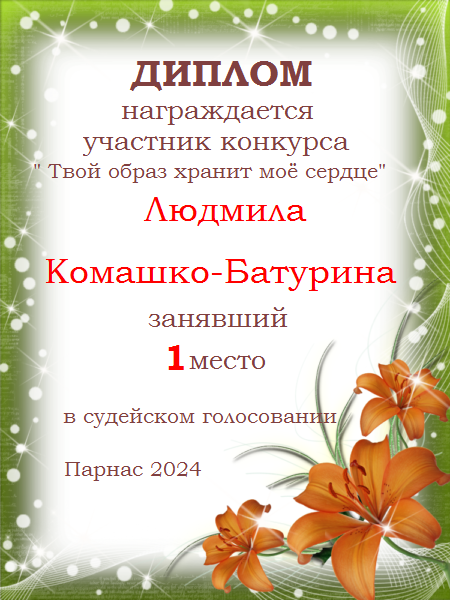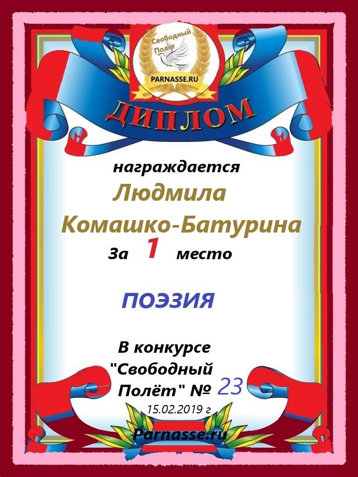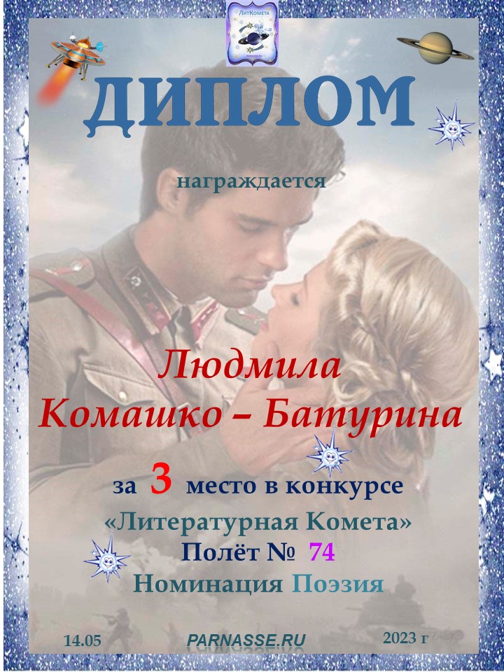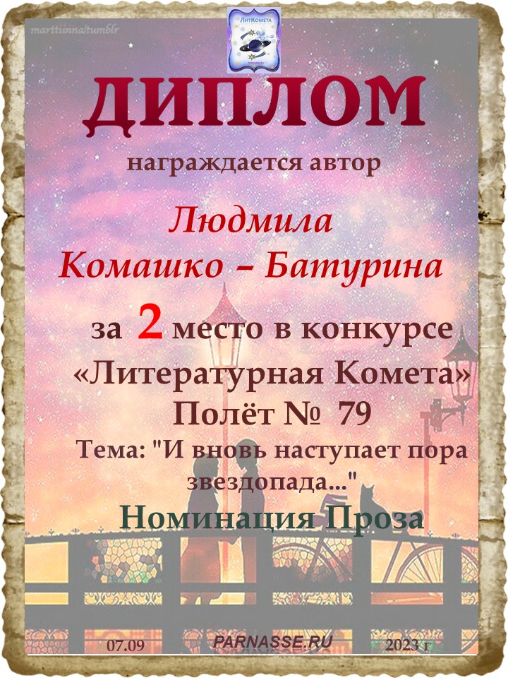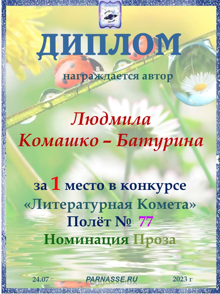 Поздравляю с 1 местом в конкурсе "Литературная Комета - Полёт № 24" номинация Проза! Спасибо за творчество!