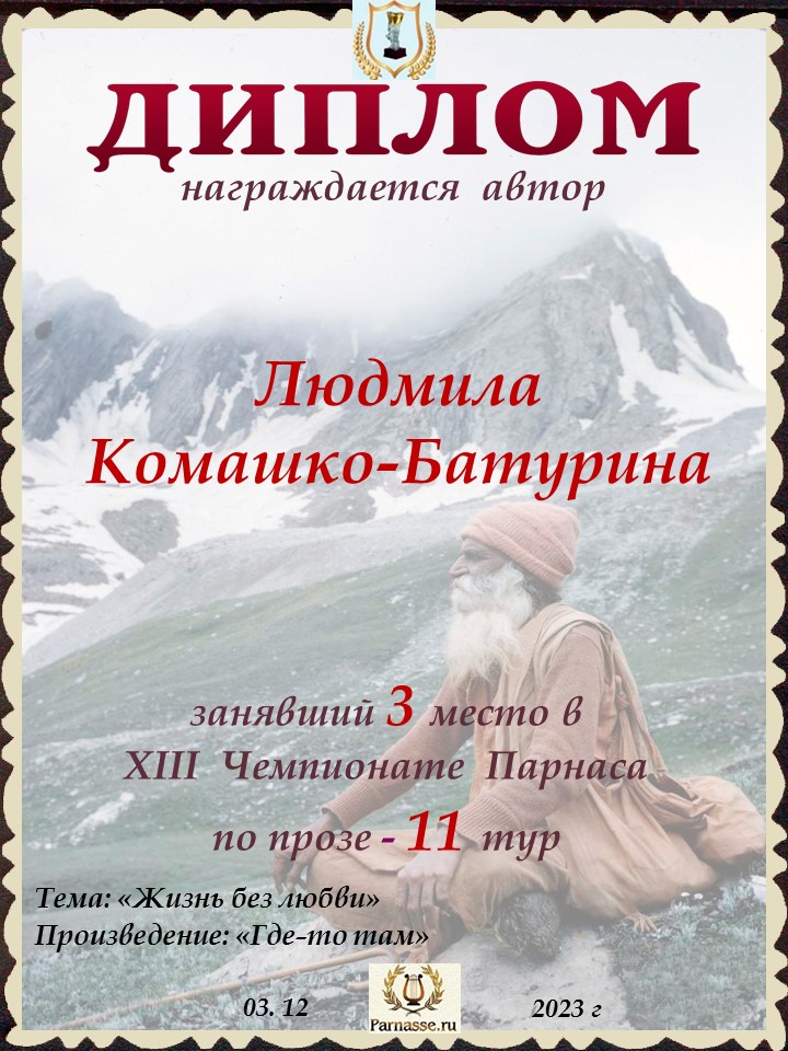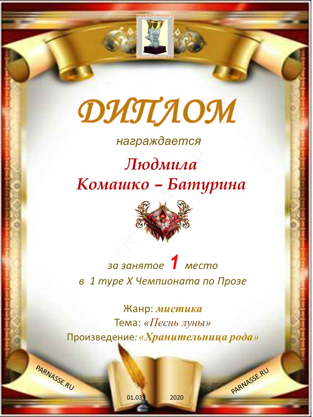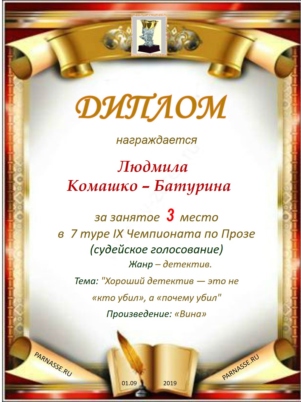 ![]() Медаль за 1 место в 3 туре XV Чемпионата Парнаса по прозе
