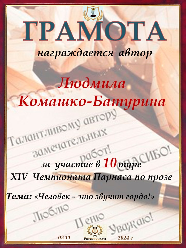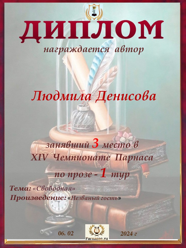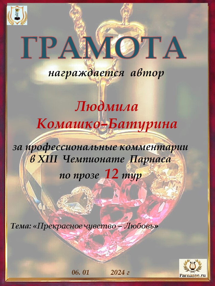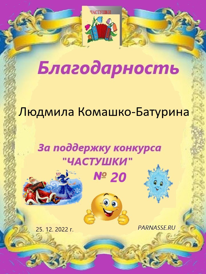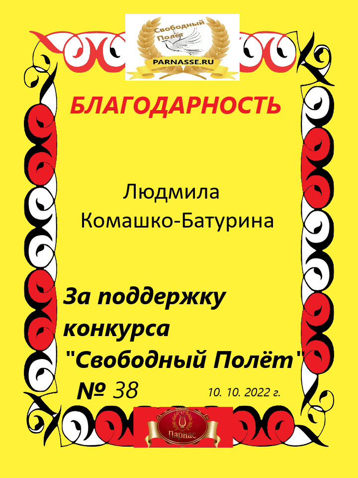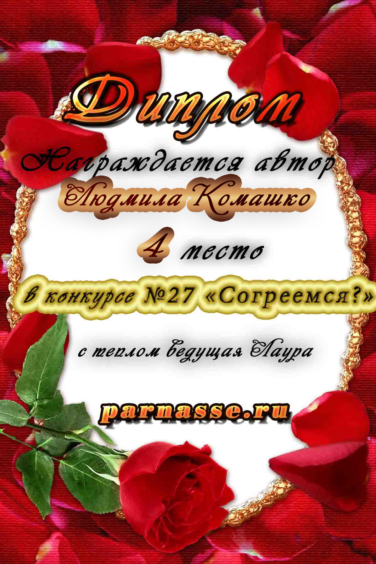 Номинация "Лучшее поздравление Парнасу в прозе".Искренне и от всего сердца благодарим Вас, ЛЮДМИЛА, за участие в юбилейном конкурсе, за Ваши прекрасные, ярчайшие слова благодарности нашему порталу! Мы желаем Вам крепкого здоровья, жизнелюбия, творческой Музы и исполнения самых заветных желаний, которые только у Вас есть!