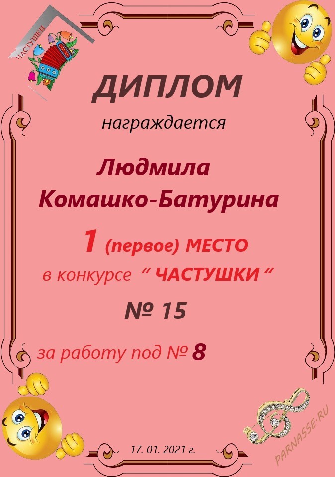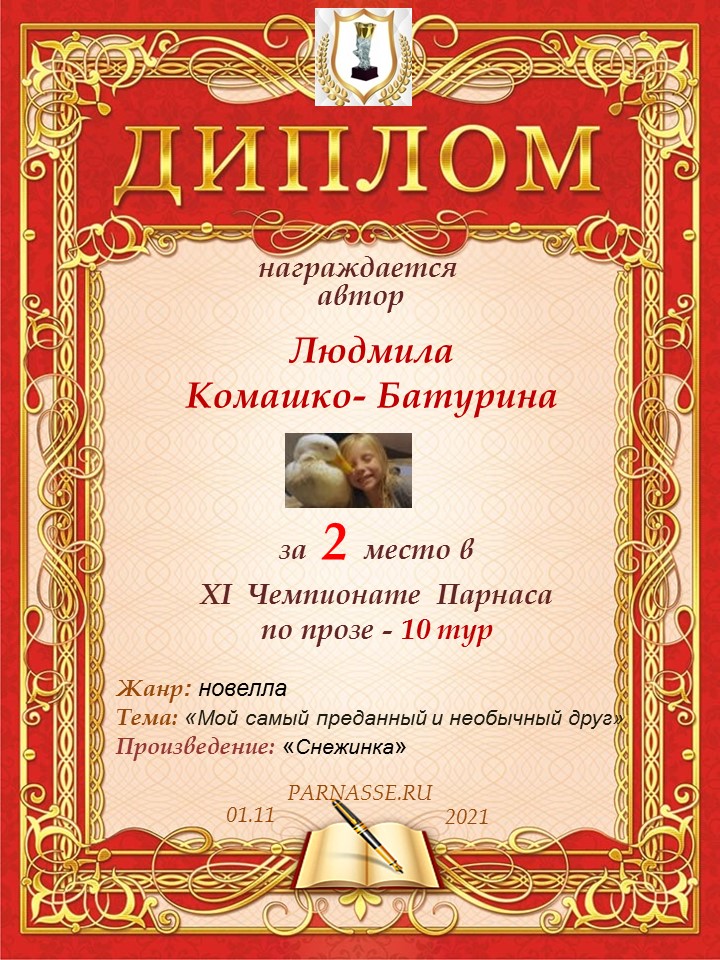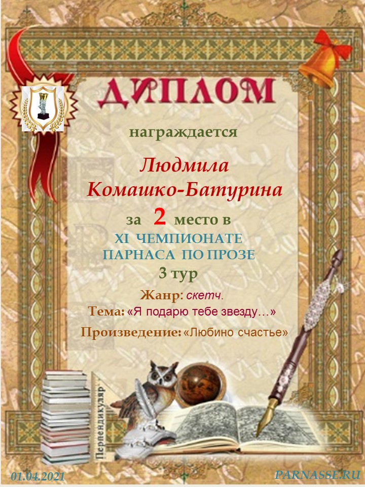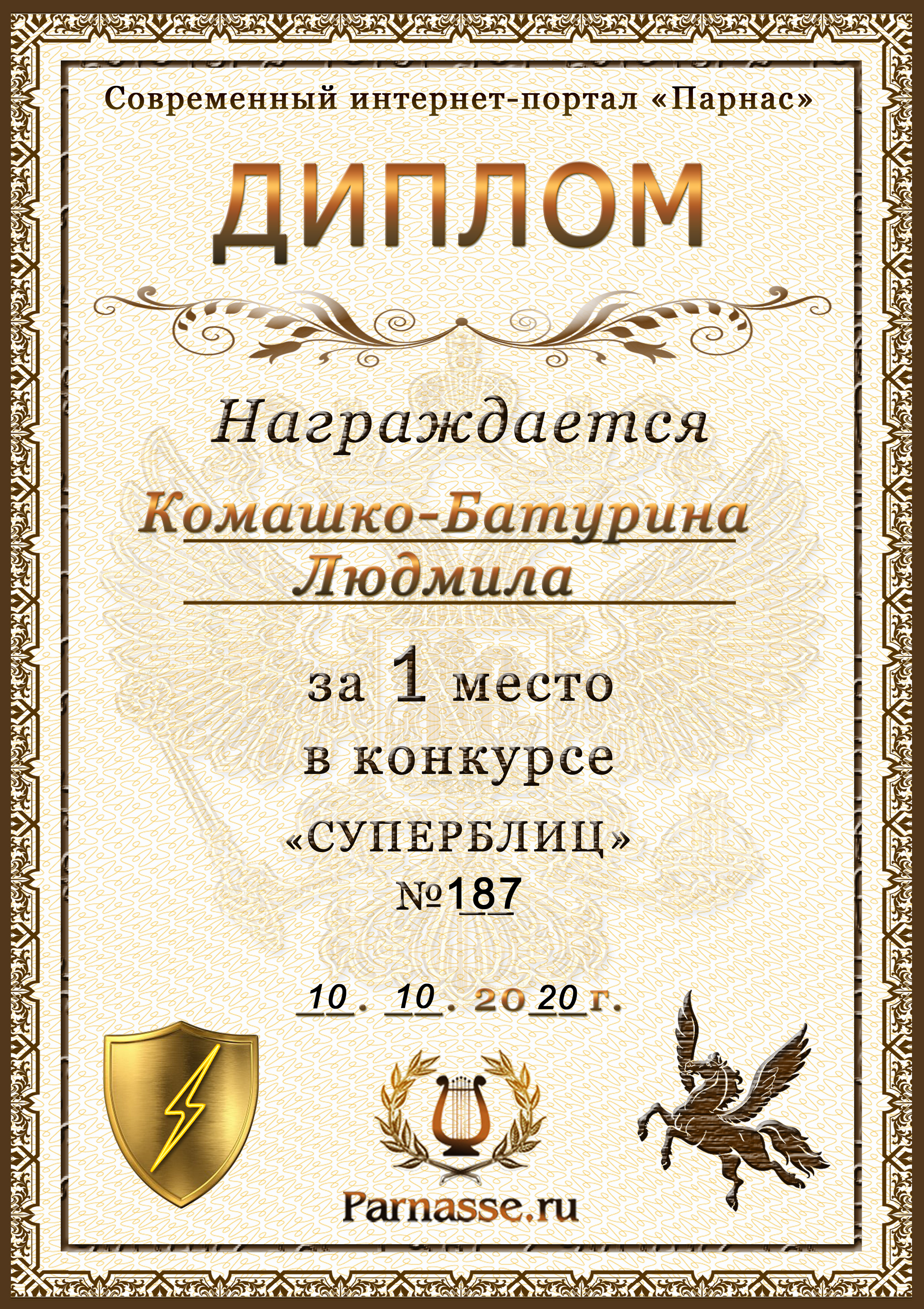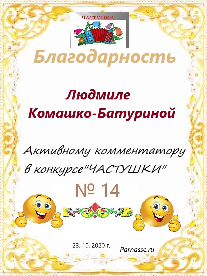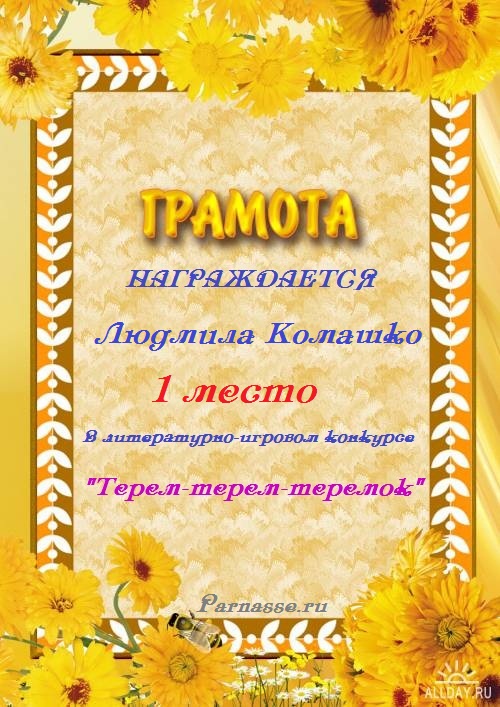 Номинация "Лучшее поздравление Парнасу в прозе".Искренне и от всего сердца благодарим Вас, ЛЮДМИЛА, за участие в юбилейном конкурсе, за Ваши прекрасные, ярчайшие слова благодарности нашему порталу! Мы желаем Вам крепкого здоровья, жизнелюбия, творческой Музы и исполнения самых заветных желаний, которые только у Вас есть!