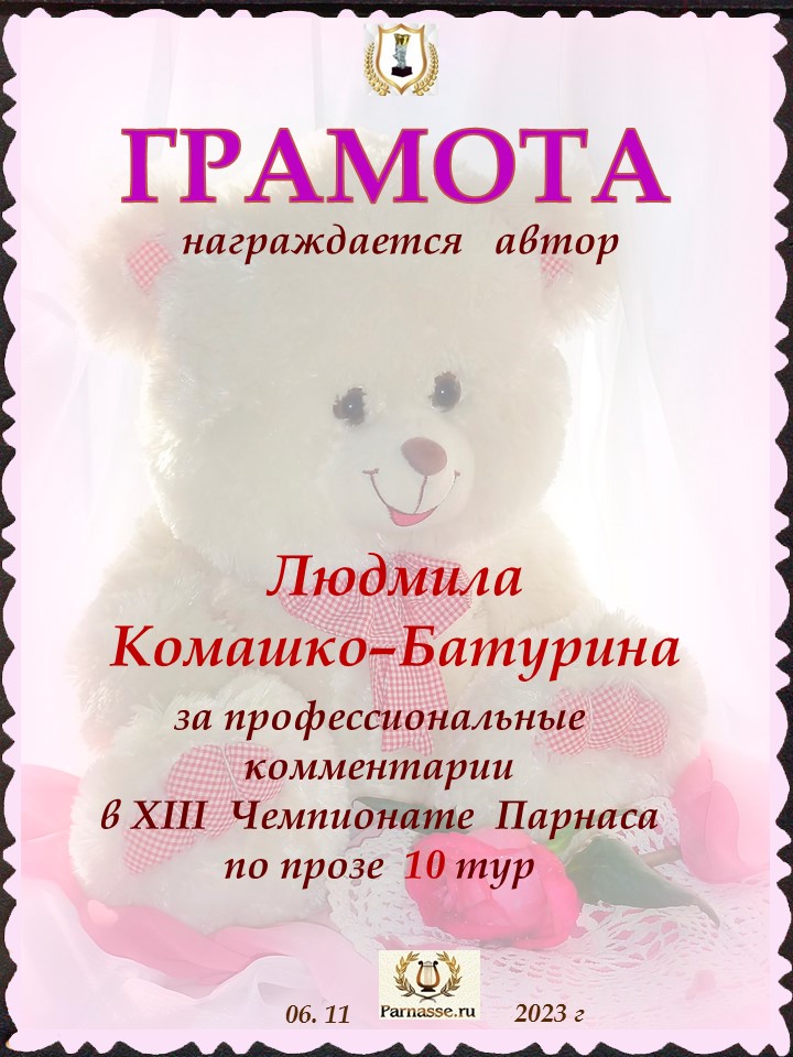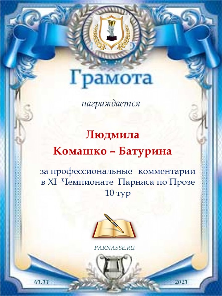 ![]() Медаль комментатора в 10 туре XV Чемпионата Парнаса по прозе