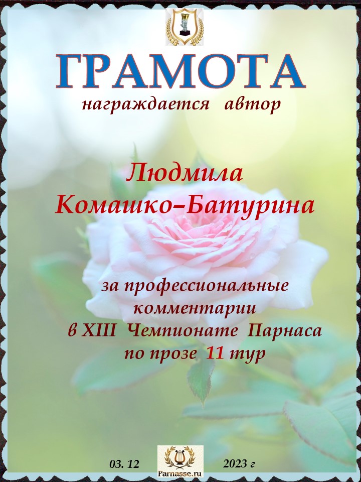![]() Медаль комментатора в 11 туре XV Чемпионата Парнаса по прозе
