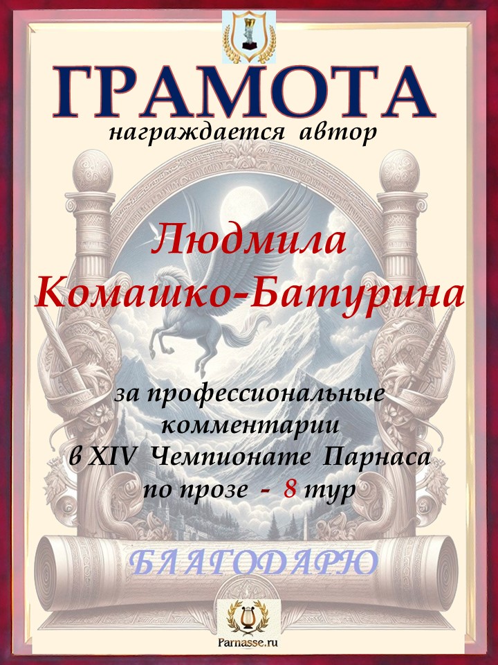 ![]() Медаль комментатора в 8 туре XV Чемпионата Парнаса по прозе