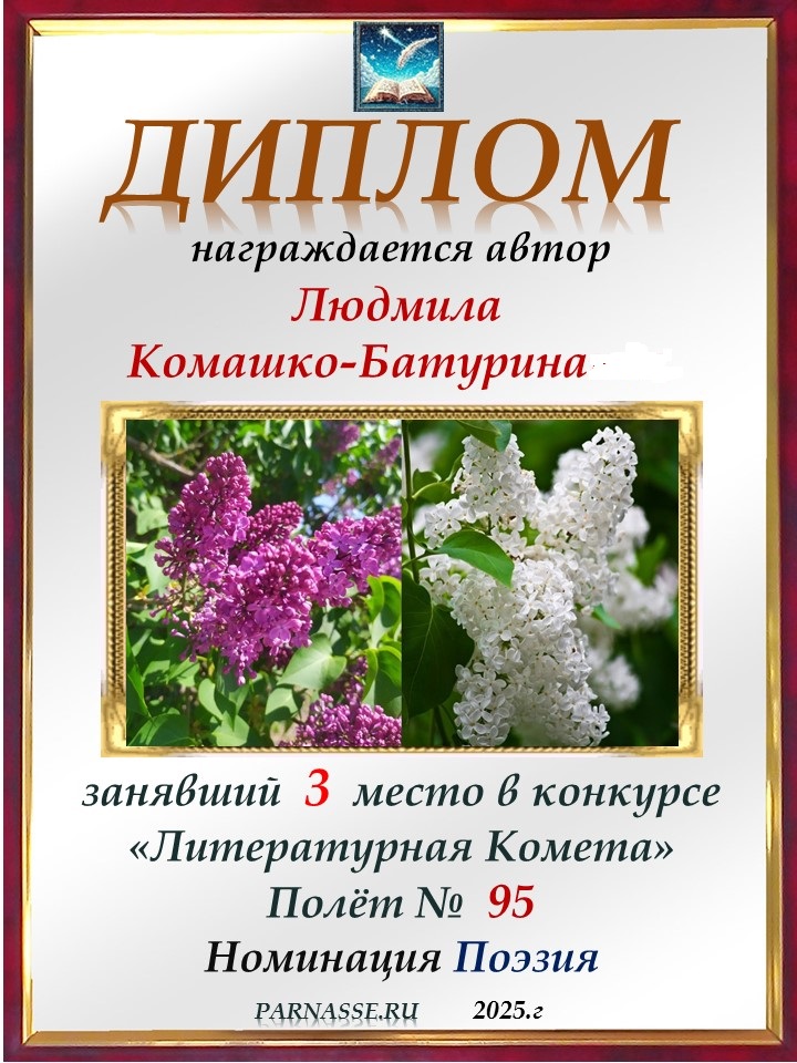 ![]() Меаль за 3 место в конкурсе "ЛитКомета - Полёт № 95" - номинация Поэзия