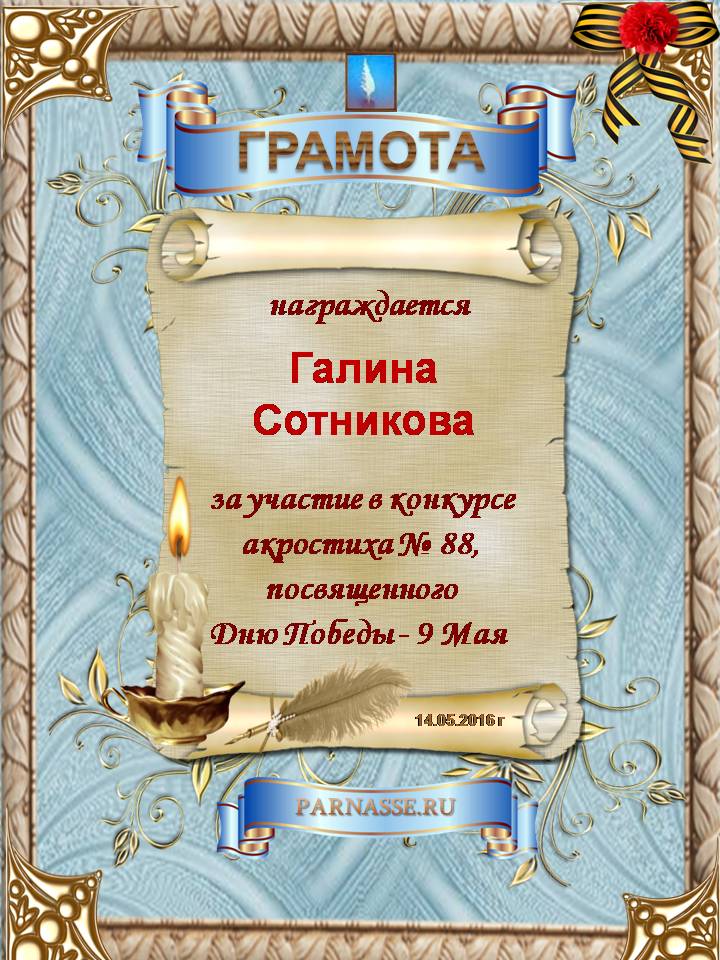 Грамота за участие в 88 конкурсе АКРОСТИХА, посвященном празднику Победы!ПОЗДРАВЛЯЮ!