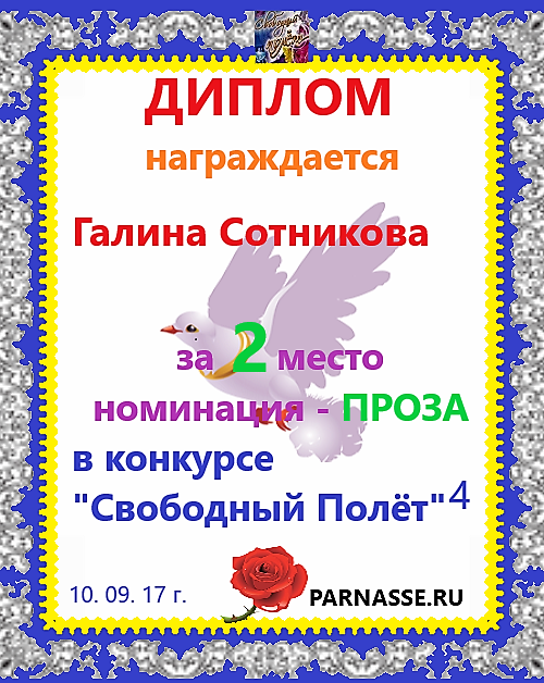 Поздравляем с занятым 3 местом в ЛИТКОНКУРСе «Золотом рассыпался сентябрь.,,», номинация – Проза (народное голосование)!