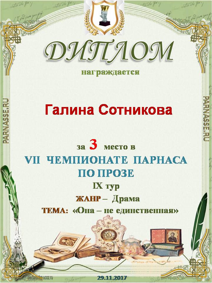 Поздравляю с занятым 3 местом в 9 туре XII Чемпионата Парнаса по прозе!