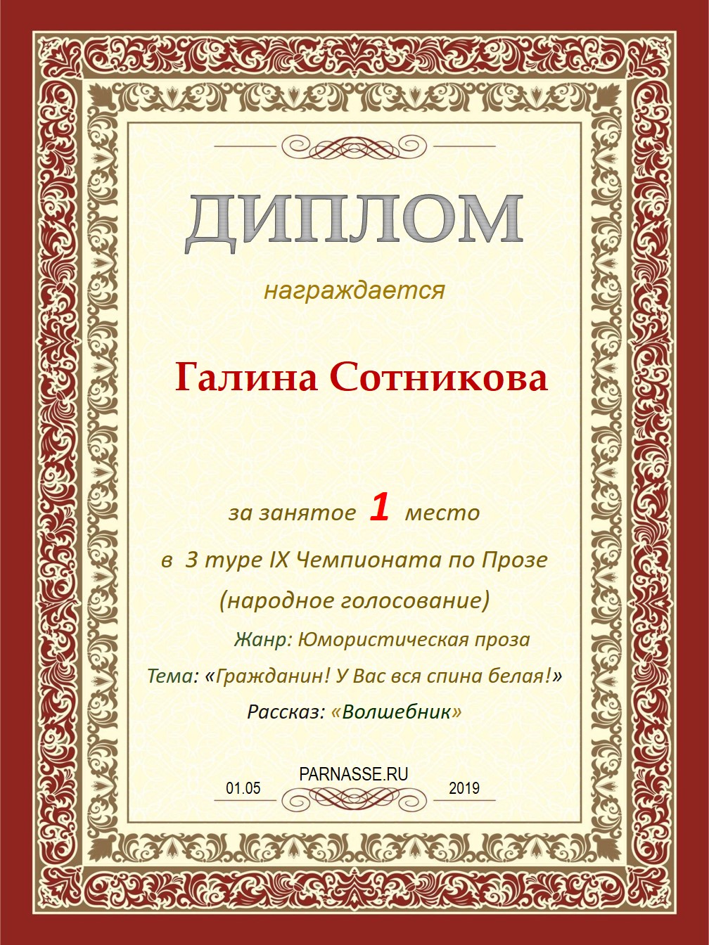 Поздравляю с занятым 1 местом в XI Чемпионате Парнаса по Прозе - 12 тур!