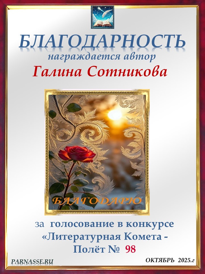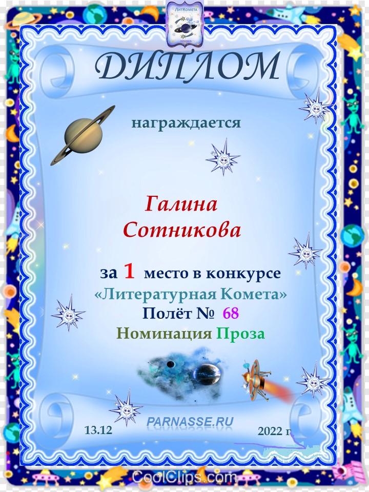 Поздравляю с занятым 1 местом в конкурсе «Литературная Комета – Полёт № 35» - номинация проза!