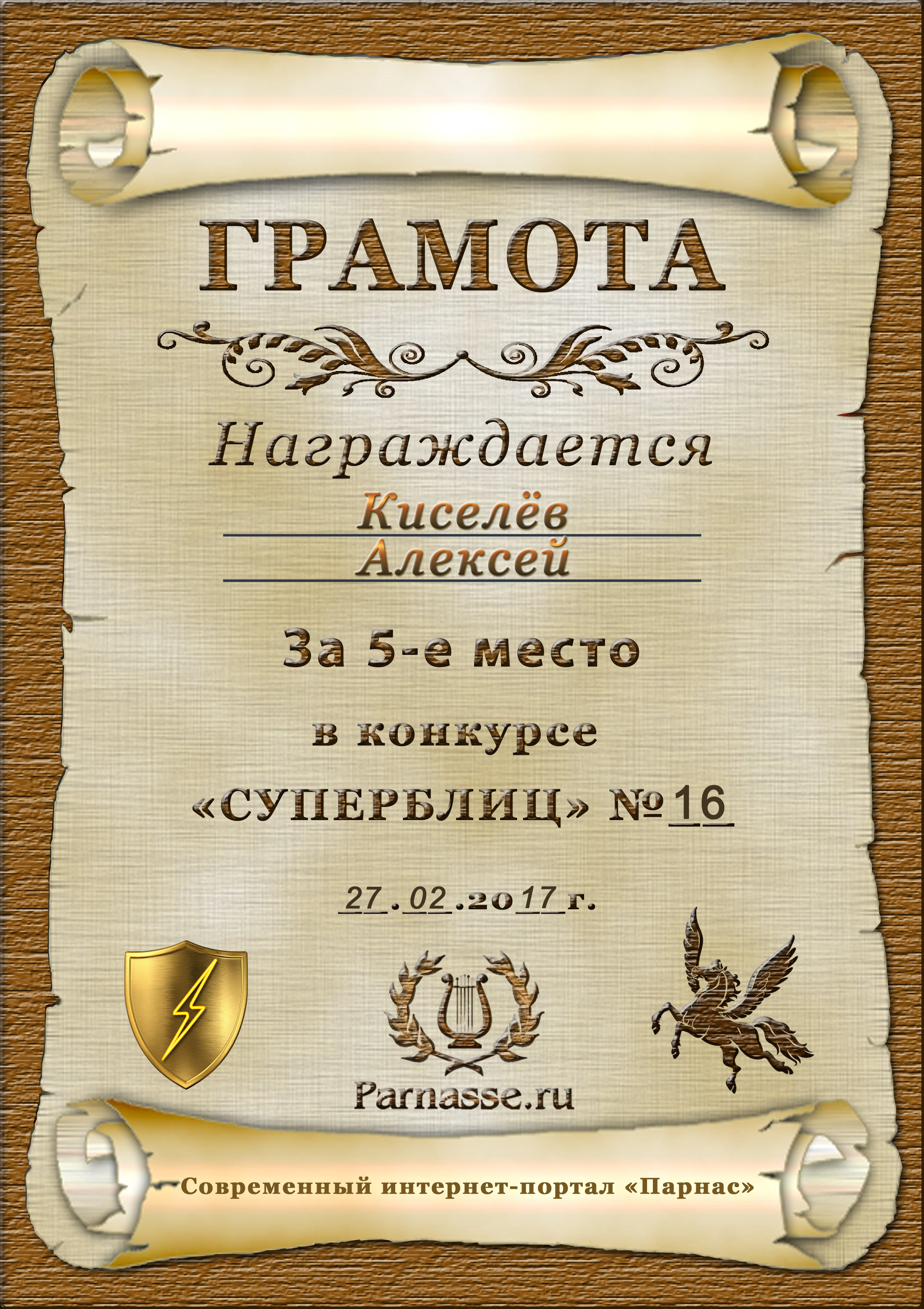 Грамота за 5 место в 16 конкурсе СУПЕРБЛИЦА!