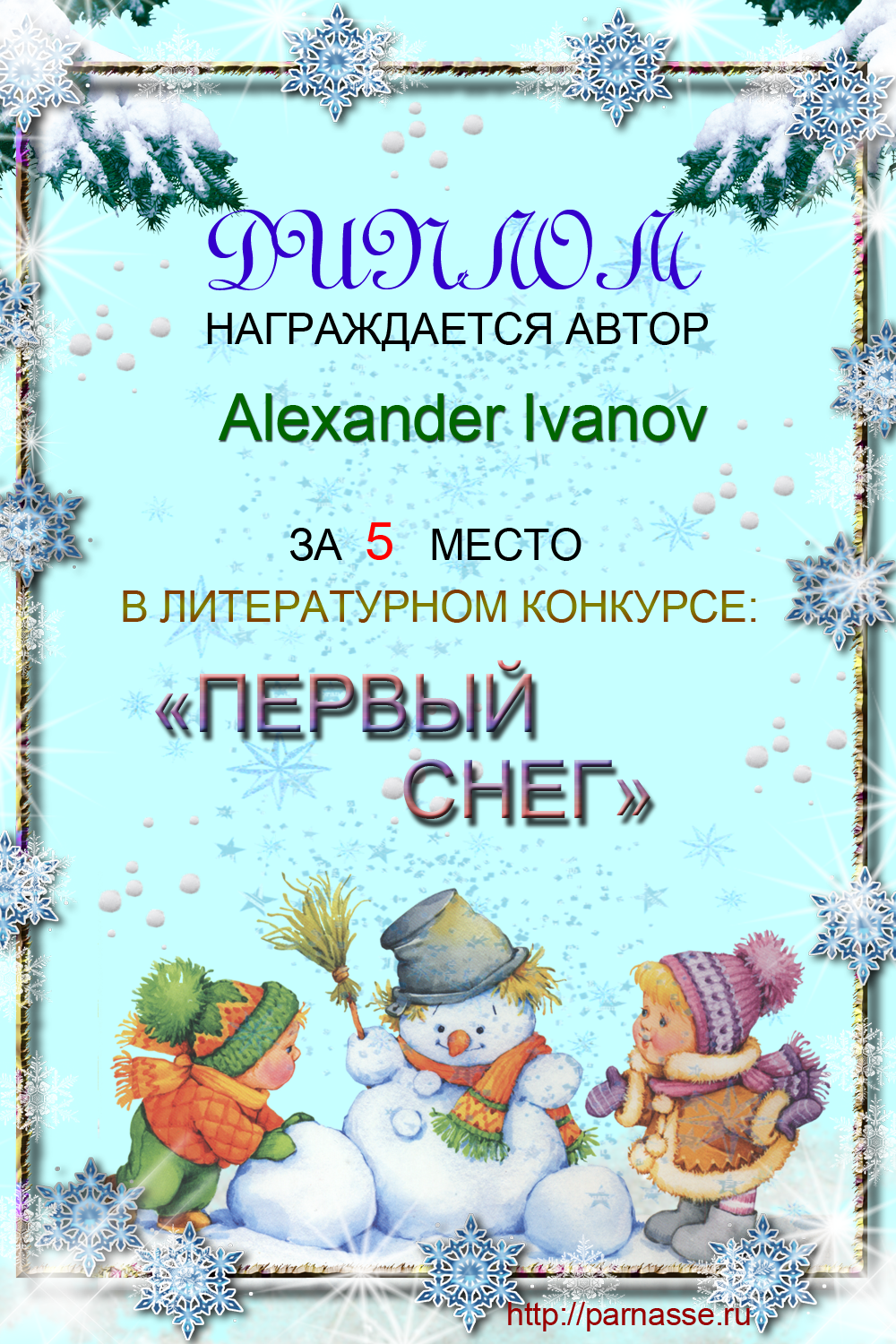 Диплом за 5 место в конкурсе "Первый снег"
