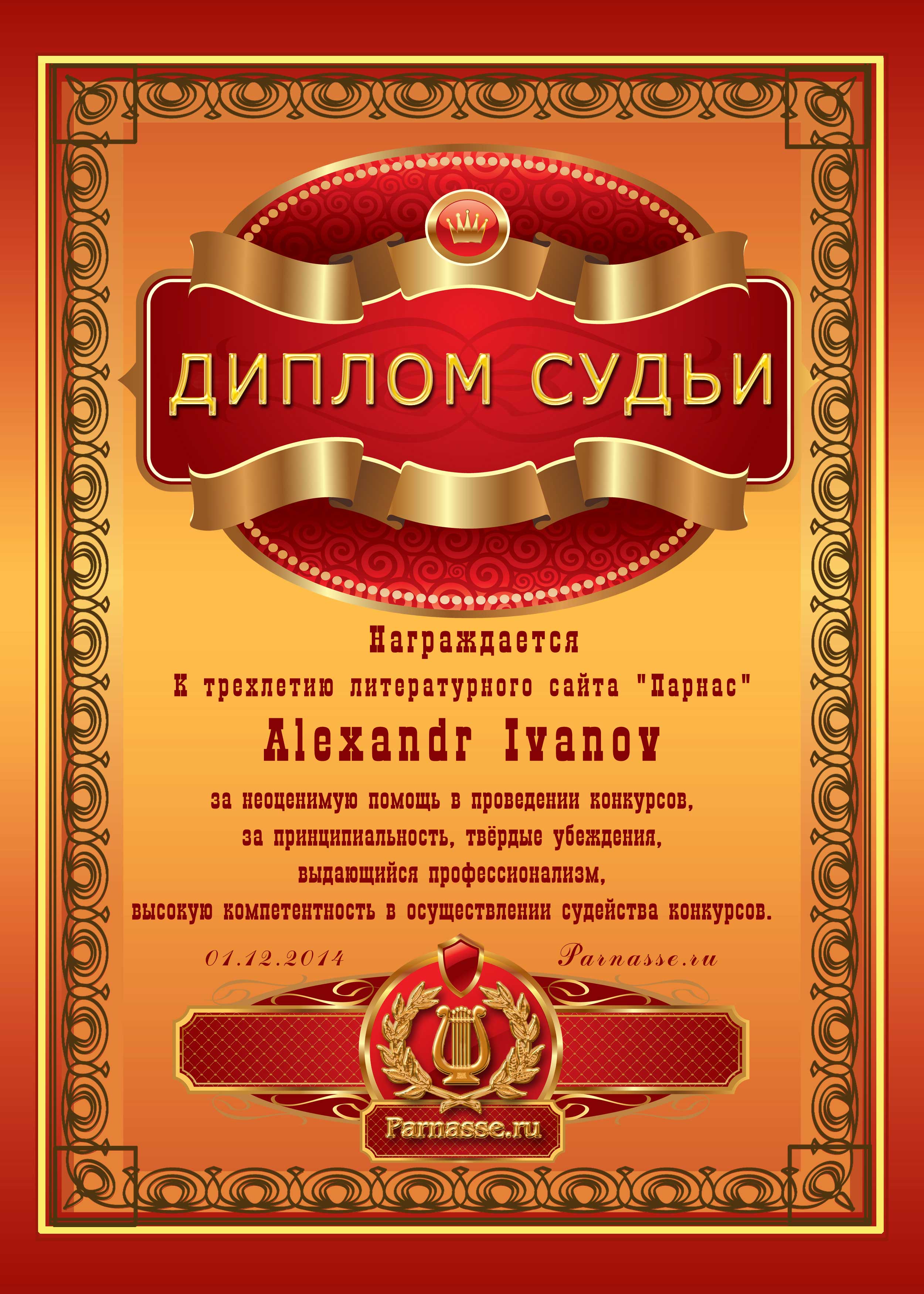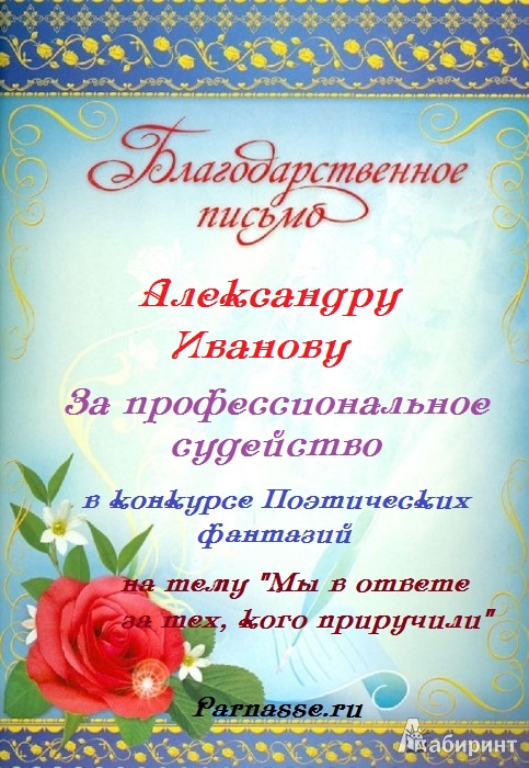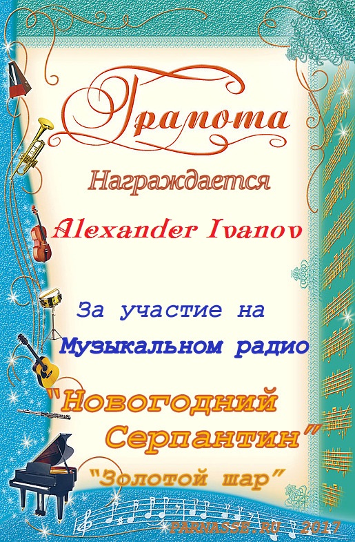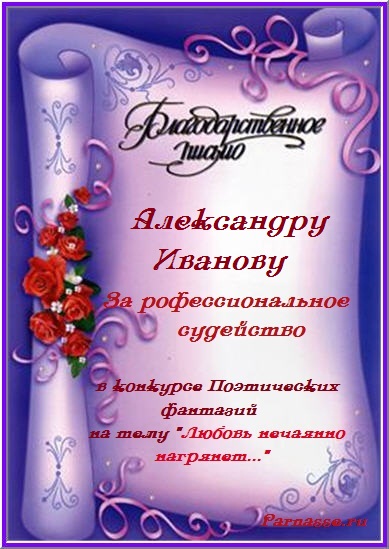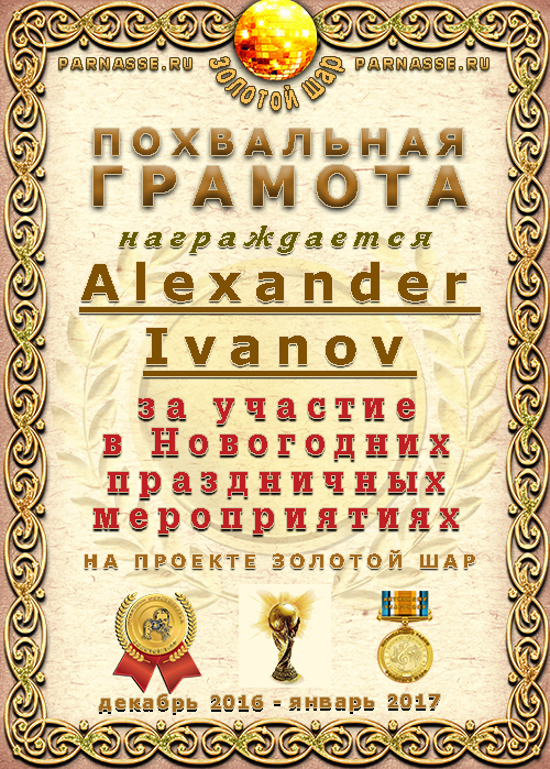 За неугасающую и неисчерпаемую творческую активность, постоянный контакт с Музой и признание сообществом "Парнасцев".От всей души желаем Вам, Александр, здоровья, любви, успехов, благополучия, удачи и творческого вдохновения!