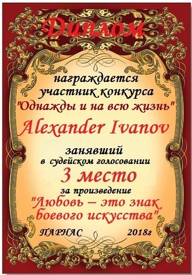 Третье место в конкурсе "Однажды и на всю жизнь" в номинации "Любовные вирши" - произведение "Любовь – это знак боевого искусства", судейское голосование. Поздравляем с победой!