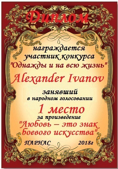 Первое место в конкурсе "Однажды и на всю жизнь" в номинации "Любовные вирши" - произведение "Любовь – это знак боевого искусства", народное голосование. Поздравляем с блестящей, заслуженной победой!