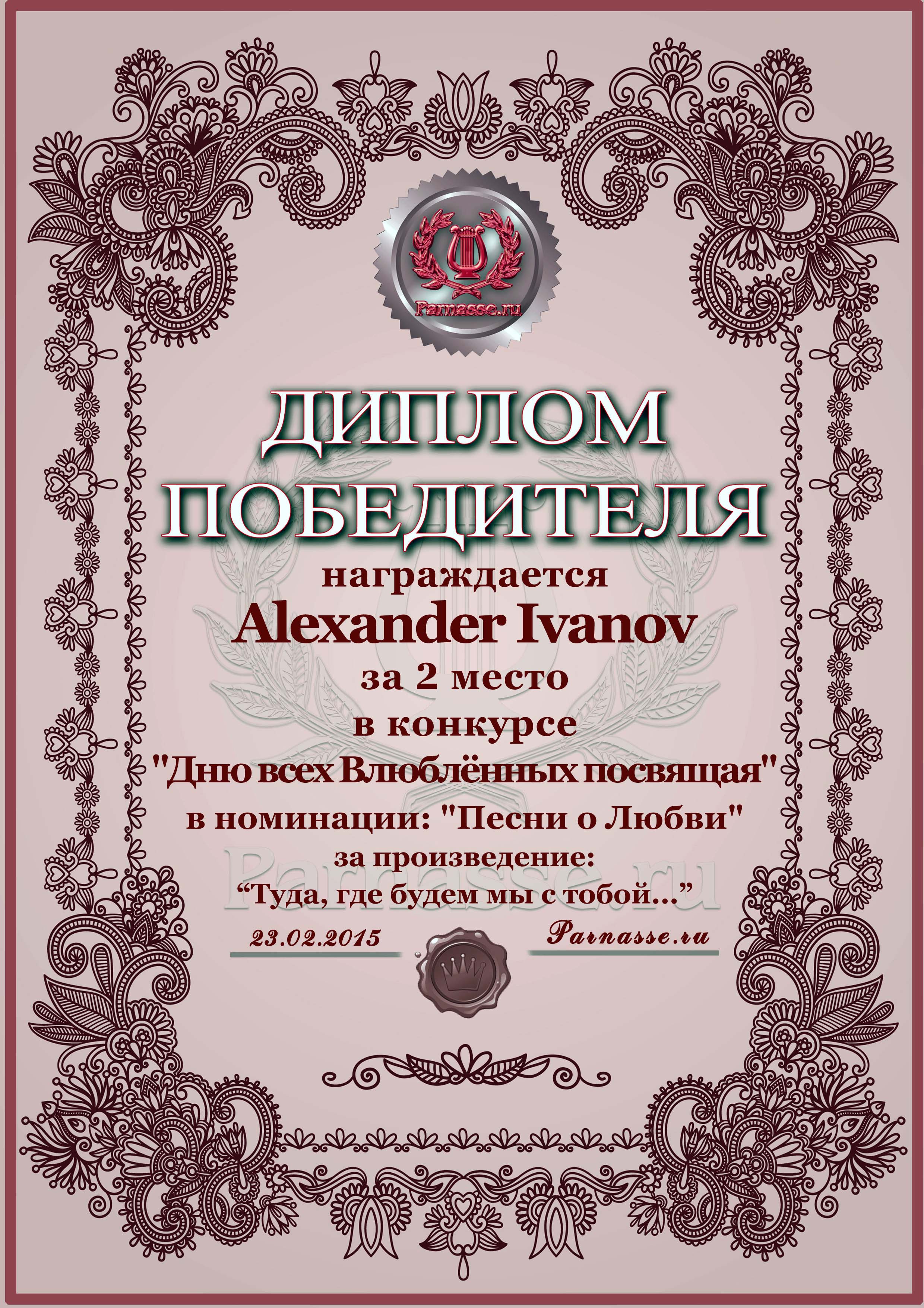 Второе место в конкурсе "Дню всех Влюблённых посвящая", песенная номинация, народное голосование, автор слов песни "Туда, где будем мы с тобой...". Поздравляем!