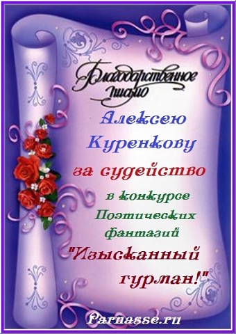 Уважаемый Алексей!Спасибо Вам большое за высокопрофессиональное, объективное судейство конкурсов на Парнасе!