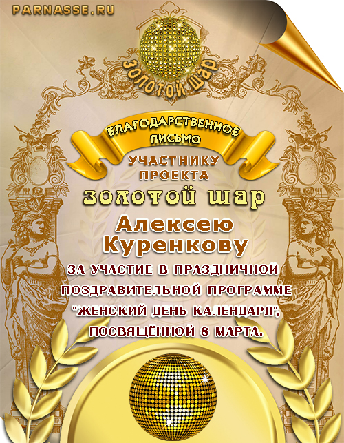 Кубок Проекта "ЗОЛОТОЙ ШАР" активному участнику!Поздравляем!