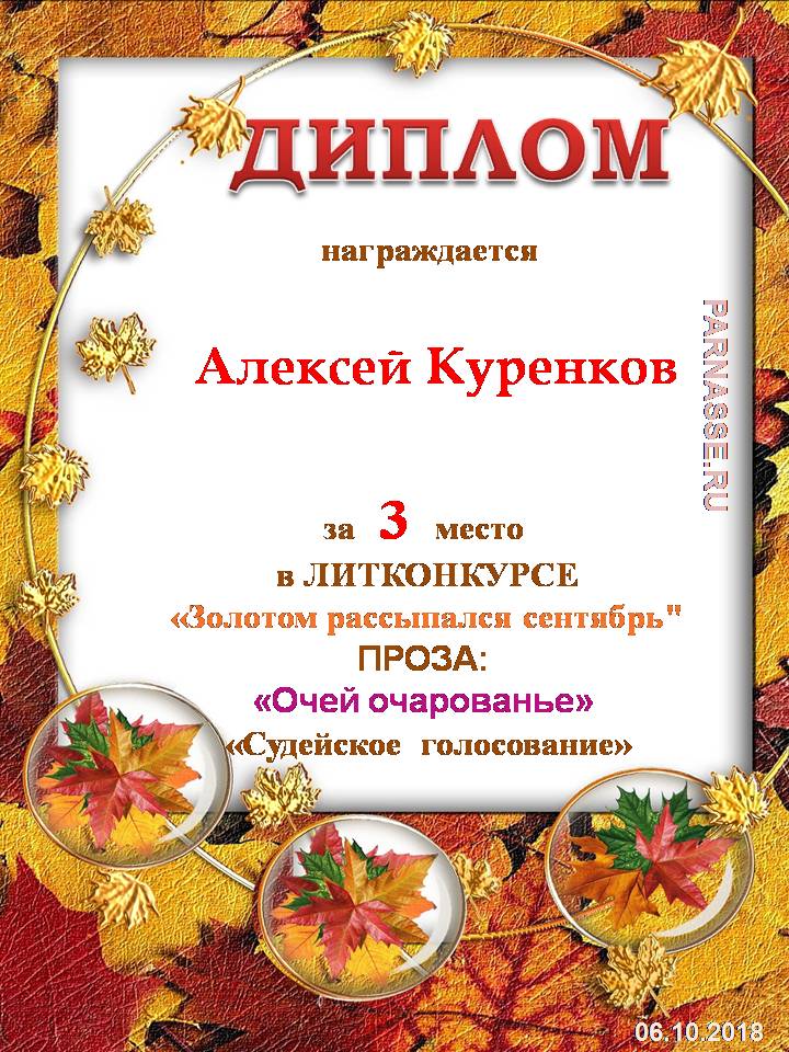 Поздравляем с занятым 3 местом в ЛИТКОНКУРСе «Золотом рассыпался сентябрь.,,», номинация – Проза (судейское голосование)!