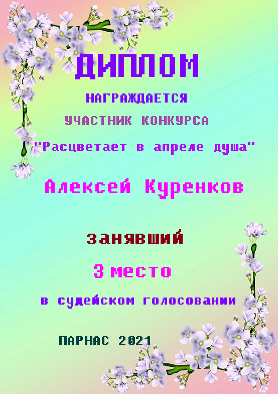 Третье место в судейском голосовании по итогам конкурса "Расцветает в апреле душа"