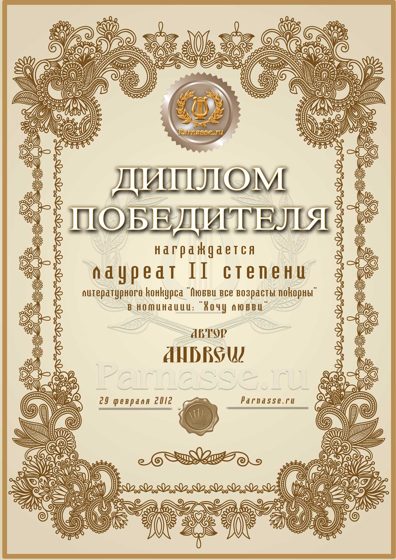 Диплом лауреата II степени сетевого лит. конкурса "Любви все возрасты покорны" в номинации "Хочу любви", (Редакторское голосование).