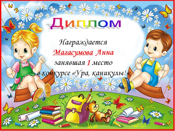 ДИПЛОМ ЗА ПЕРВОЕ МЕСТО В КОНКУРСЕ "Ура каникулы!"