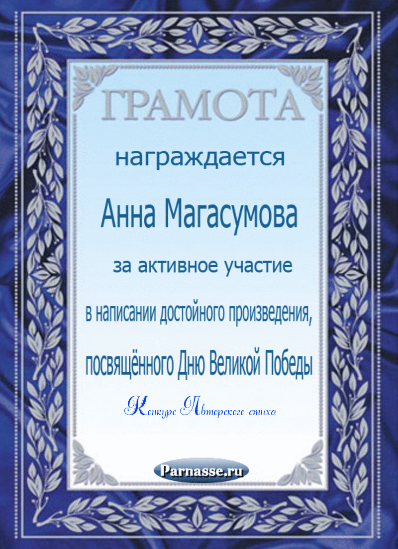 За неугасающую и неисчерпаемую творческую активность, постоянный контакт с Музой и признание сообществом "Парнасцев".