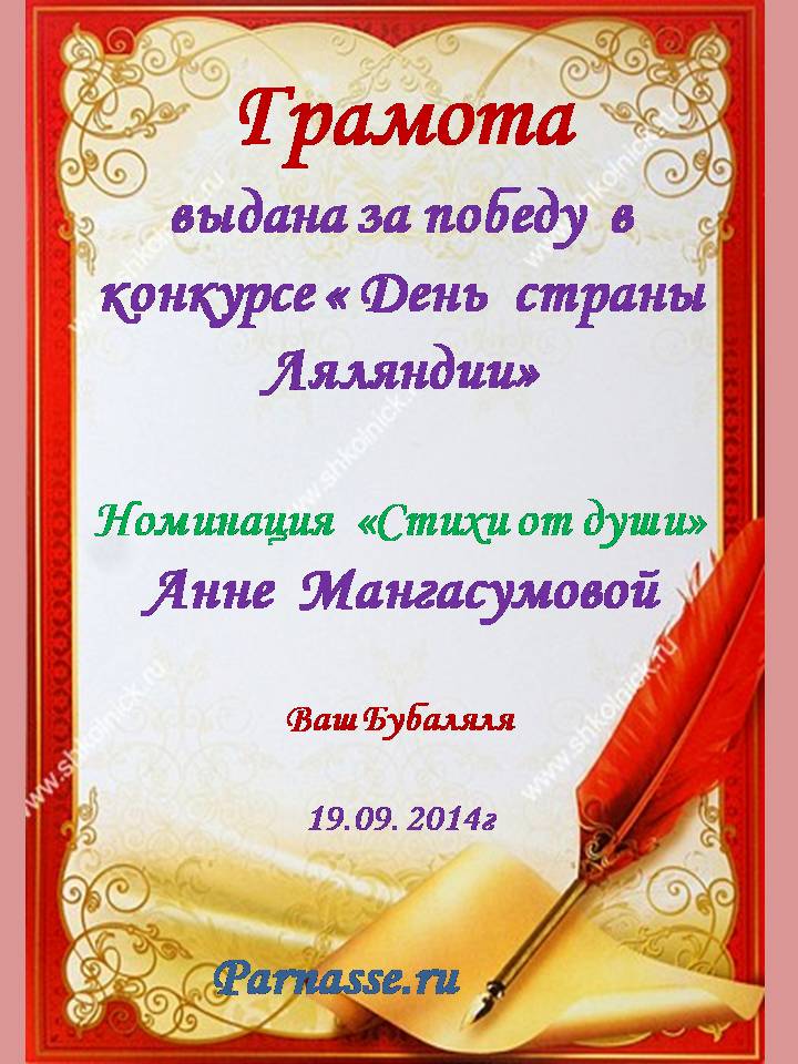 Победителю музыкально-литературного конкурса "Ах, Мама, Мамочка, родная!" Номинация "Рассказы-сказки о Мамочке". Поздравляем! Счастья Вам и всего замечательного. Желаем хорошего настроения, вдохновения и удачи во всем. Спасибо за участие в конкурсе. С Уважением, Администрация.