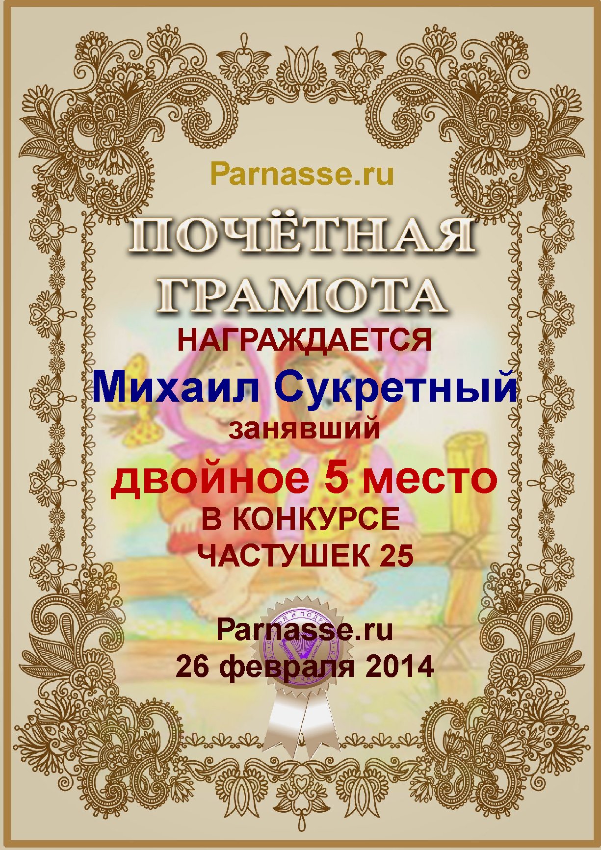Похвальная грамота за 5 место и активное участие в конкурсе лимериков № 74+ (27.04.2016 г.)