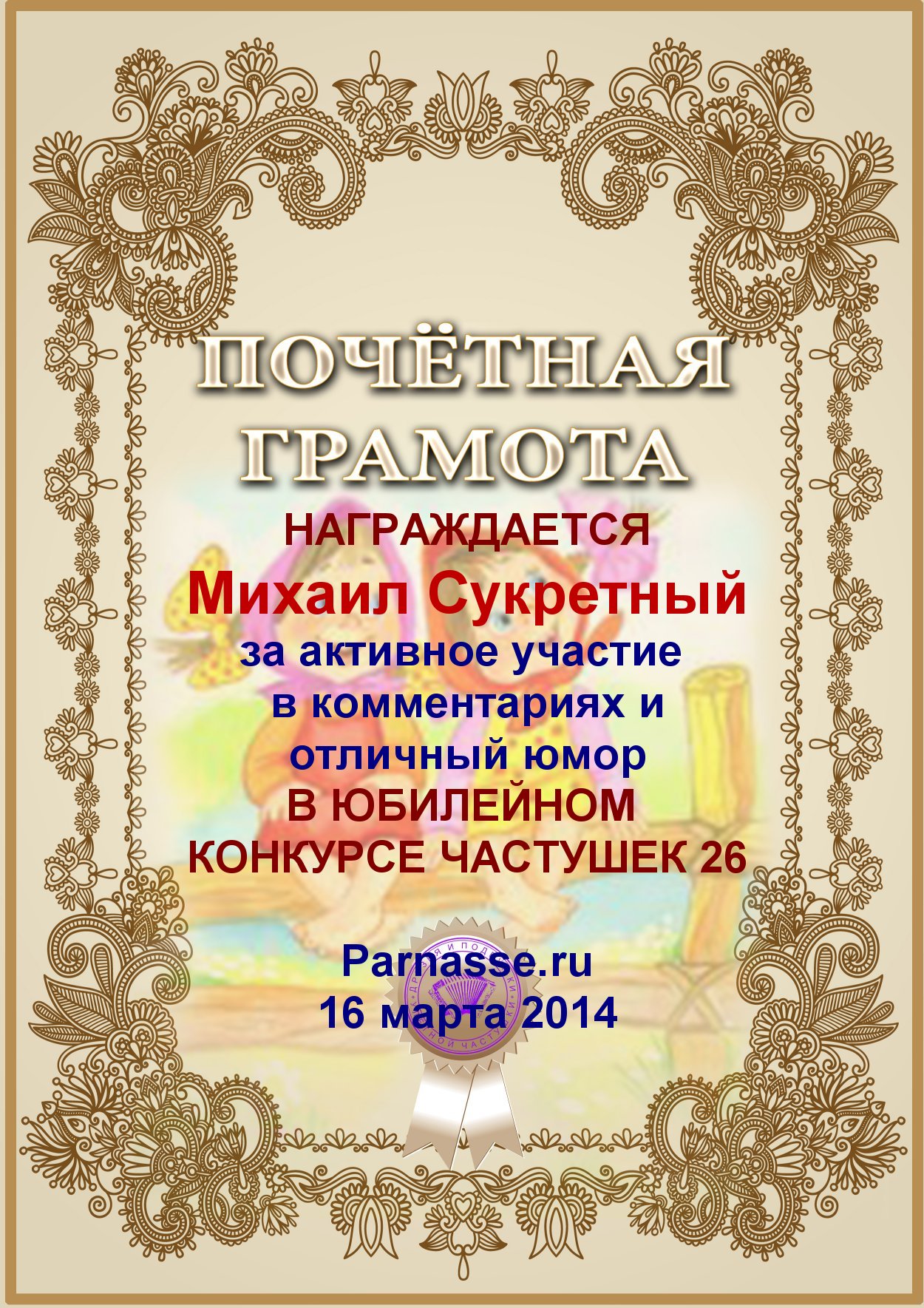 Похвальная грамота за активность в комментариях к конкурсу лимериков № 74+ (27.04.2016 г.)