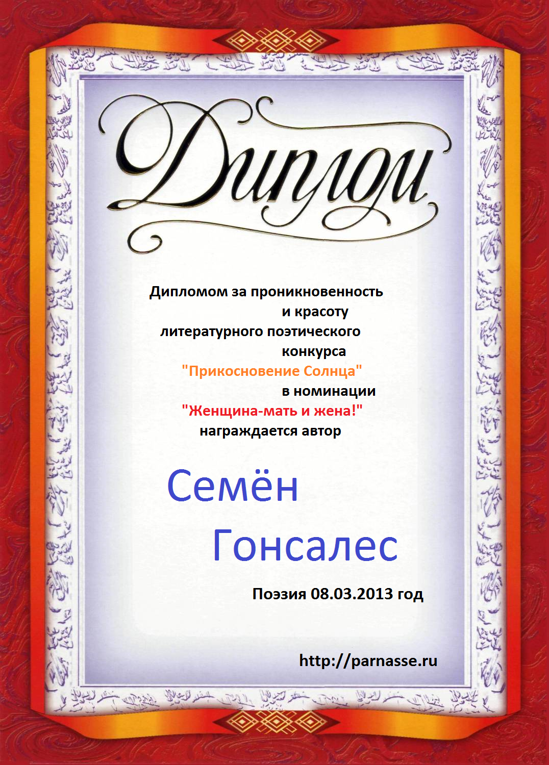 От лица Администрации творческого портала "Парнас" вручаем Вам этот памятный знак с самыми наилучшими пожеланиями! Пусть Вас весь год не покидает творческий запал, удача, а здоровье будет столь же крепким и нерушимым, как и традиция Новогоднего праздника! Счастья, успехов и любви Вам и Вашей семье, друзьям и близким!