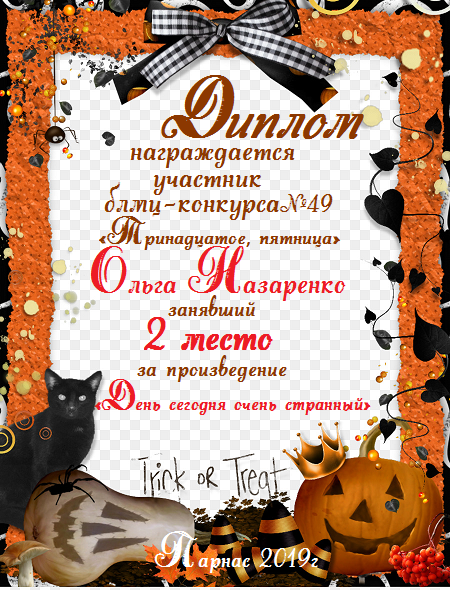 Второе место в Блиц- конкурсе №49 «Тринадцатое, пятница» за произведение «День сегодня очень странный». Поздравляем!