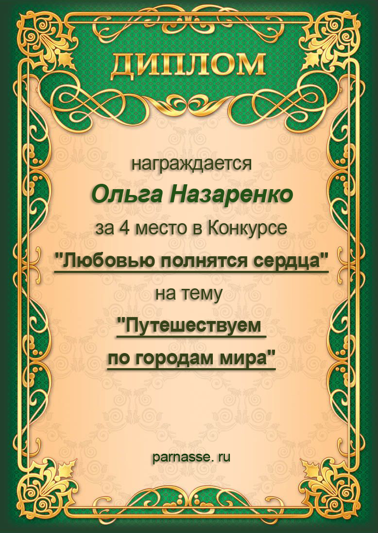 За 4 место в Конкурсе "Любовью полнятся сердца" на тему "Путешествуем по городам мира".