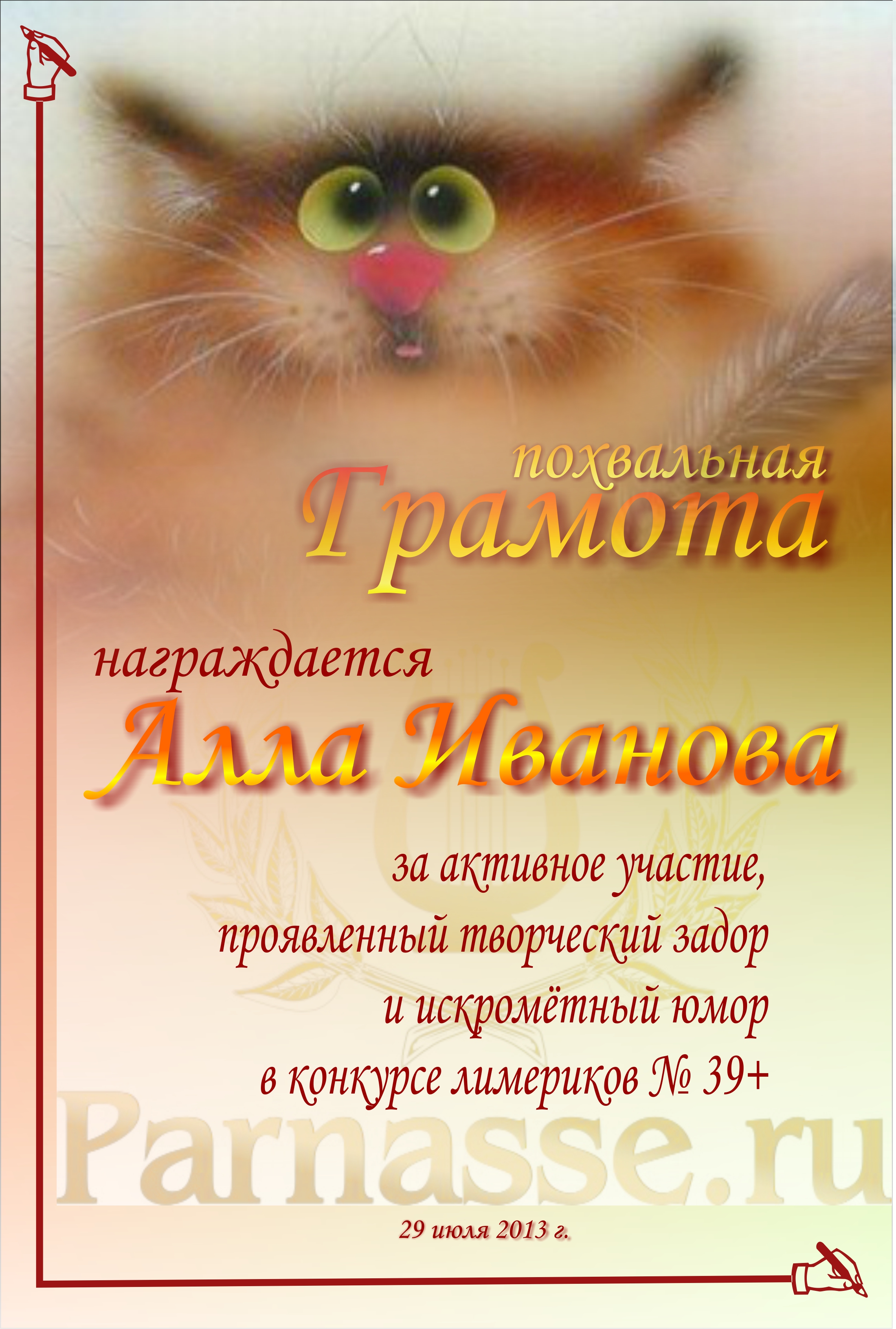 Похвальная грамота за 5 место в конкурсе лимериков № 39+ (29.07.2013 г.)