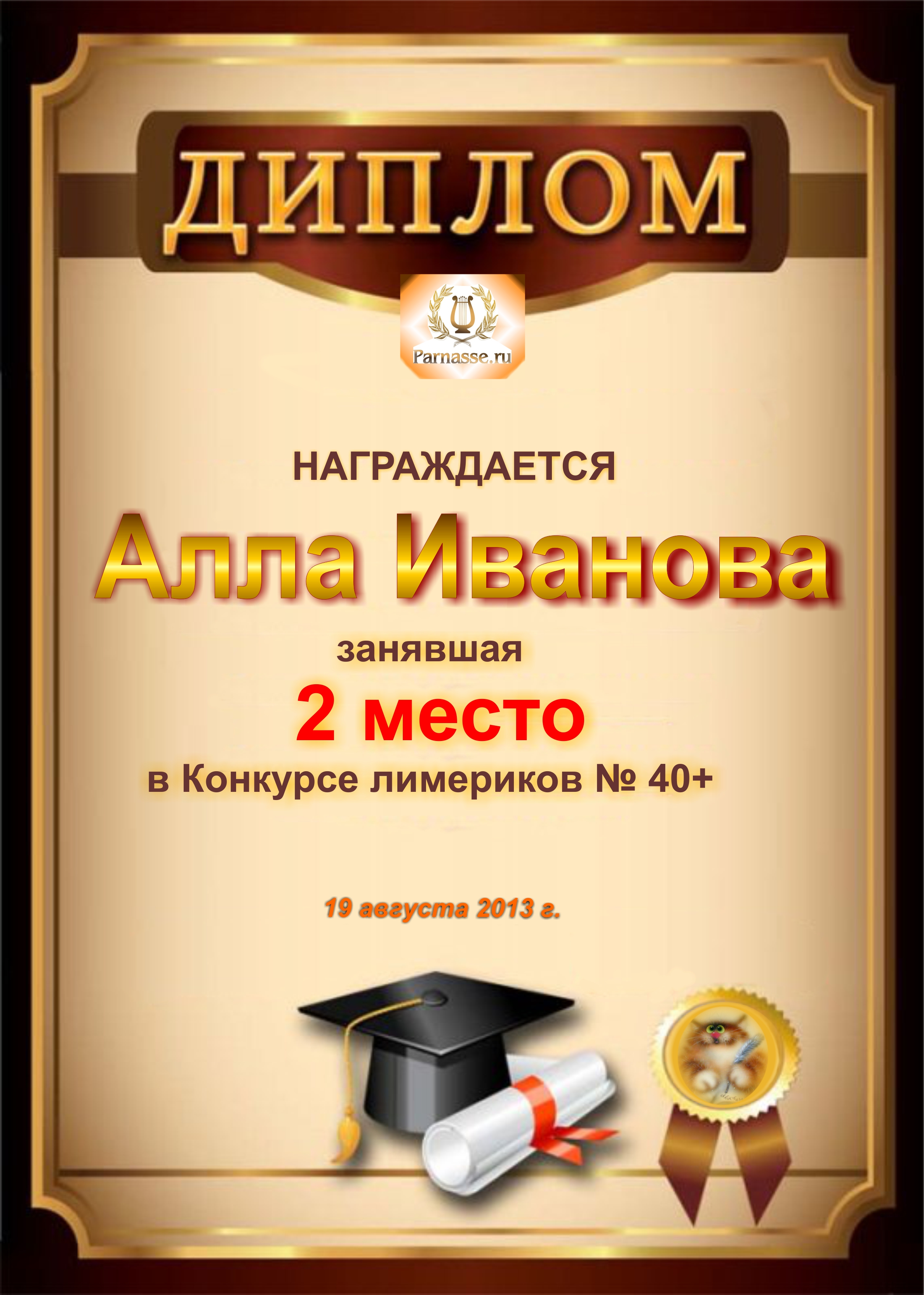 Диплом за победу и 1 место в дополнительной номинации конкурса лимериков № 41+ (9.09.2013г.)