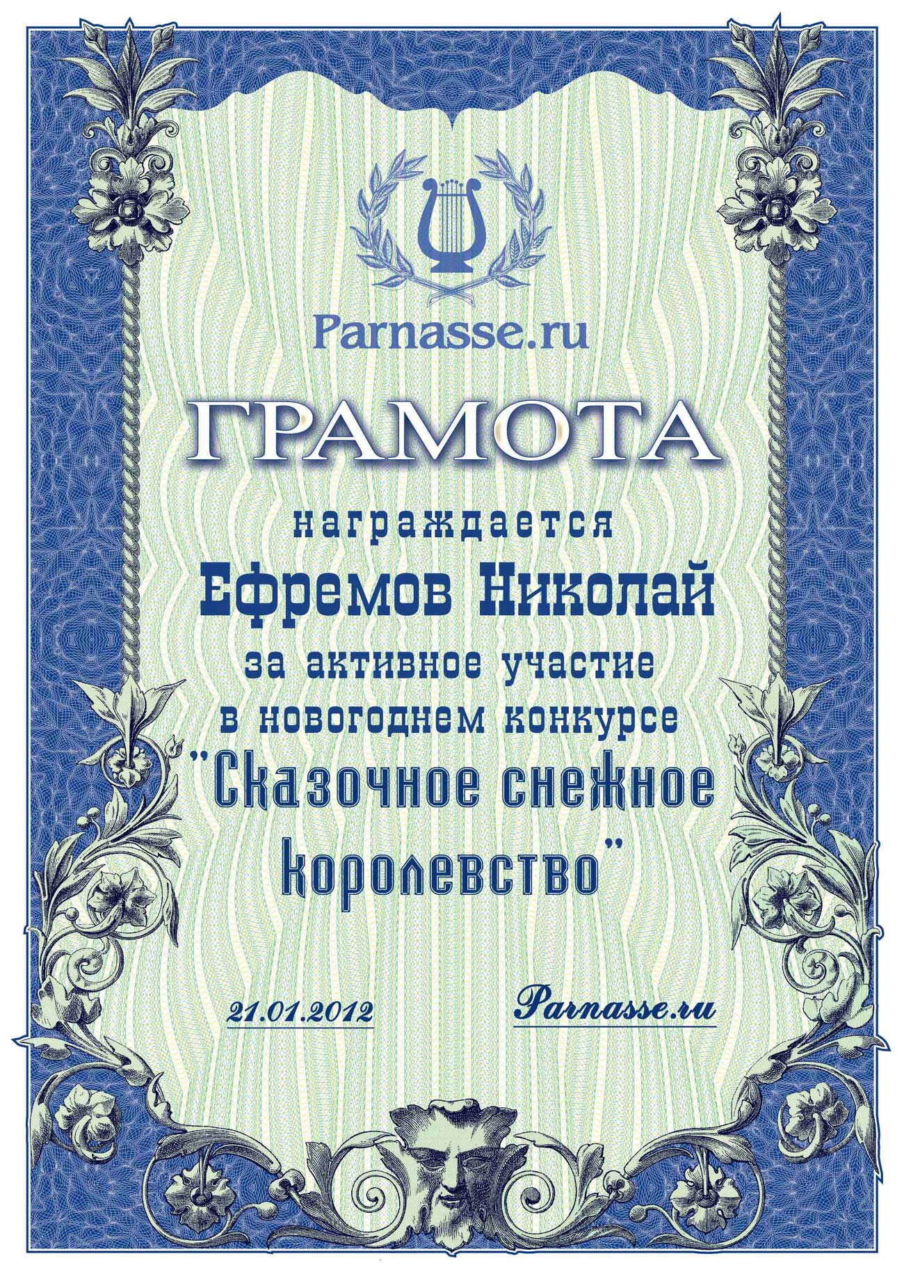 От лица Администрации творческого портала "Парнас" вручаем Вам этот памятный знак с самыми наилучшими пожеланиями! Пусть Вас весь год не покидает творческий запал, удача, а здоровье будет столь же крепким и нерушимым, как и традиция Новогоднего праздника! Счастья, успехов и любви Вам и Вашей семье, друзьям и близким!