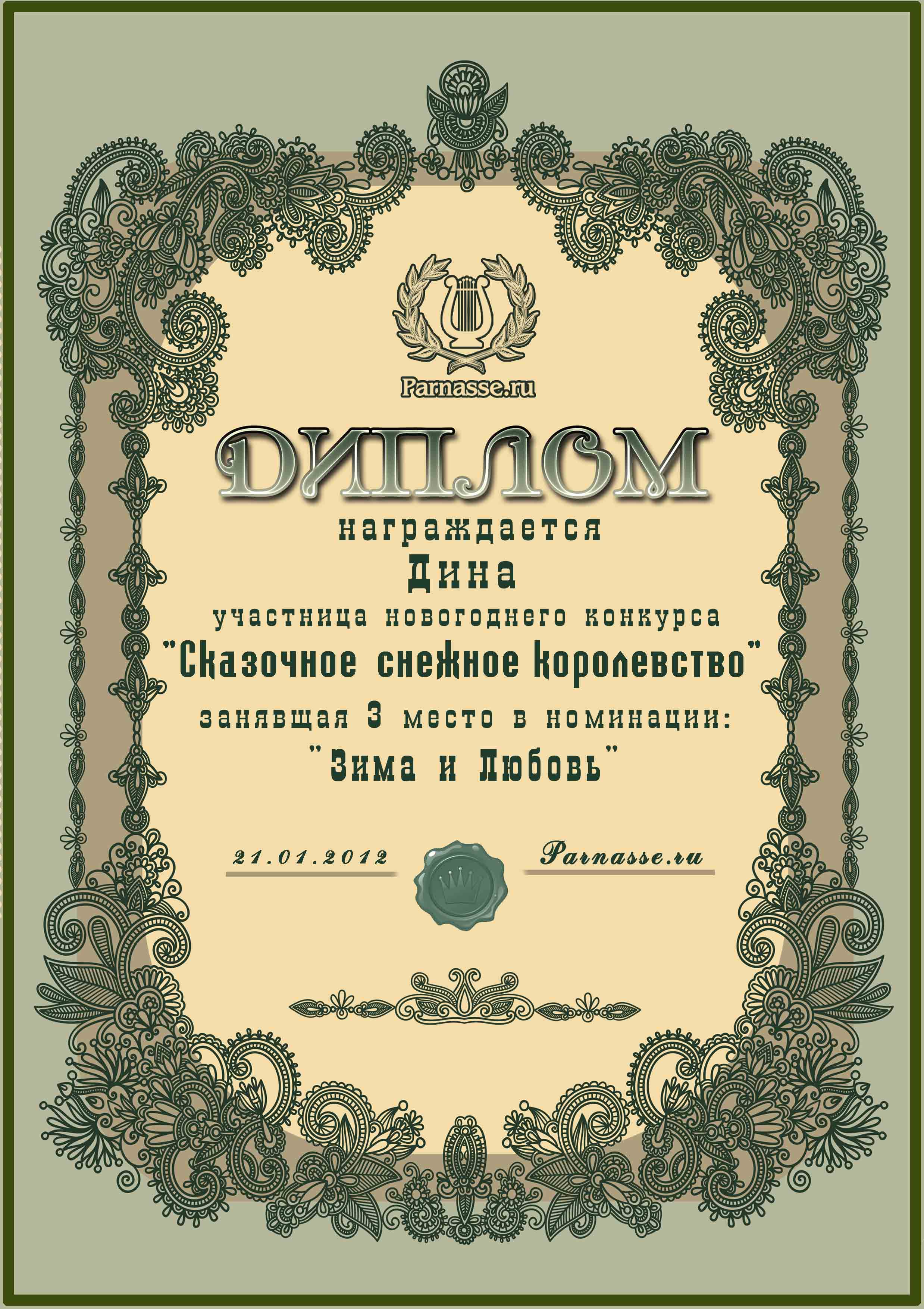 Третье место в конкурсе "Зимою литератор торжествует, в блокноте создавая чудеса!" номинация "Рассказы-сказки о Зимушке-Зиме", рассказ "Сказка о Морозко, ягоде-клюкве и Любви" Поздравляем с заслуженной победой!