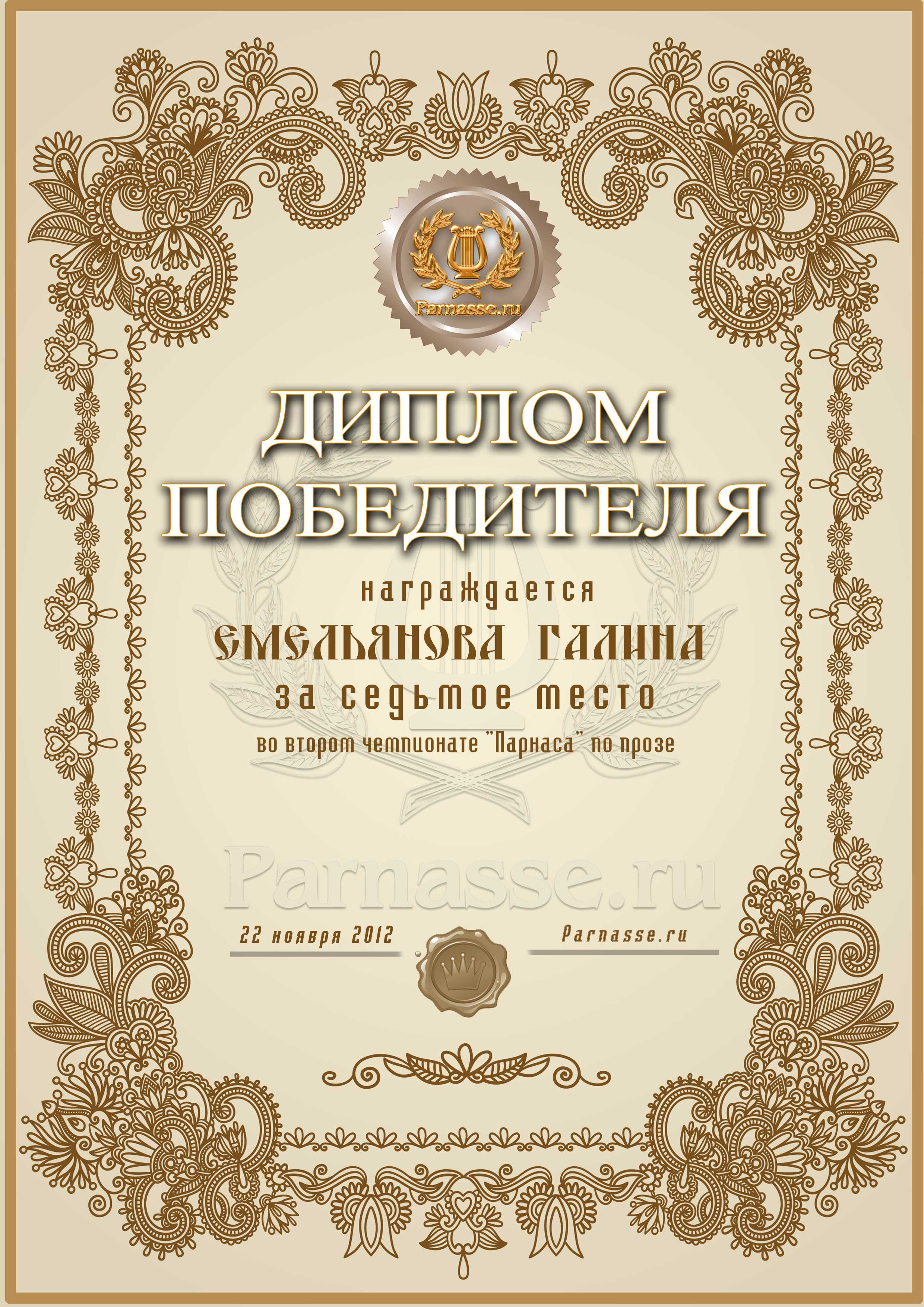 За седьмое место во втором Чемпионате Парнаса по прозе! Поздравляем! Спасибо за активное участие на Чемпионате!