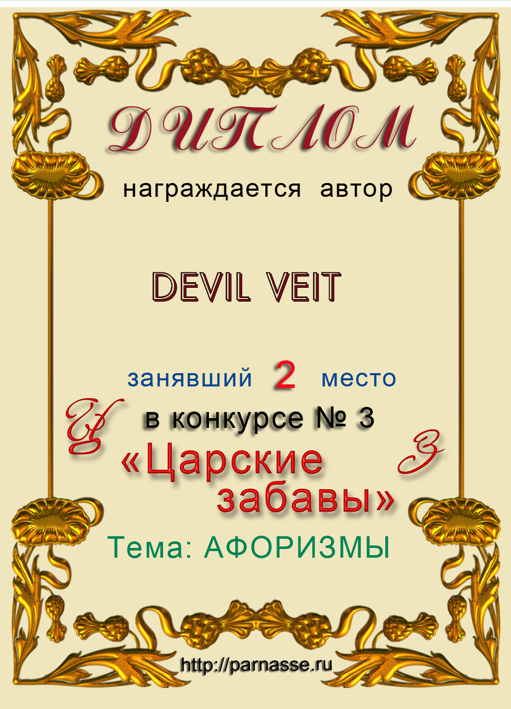 Диплом за 2 место в конкурсе Царские забавы № 3