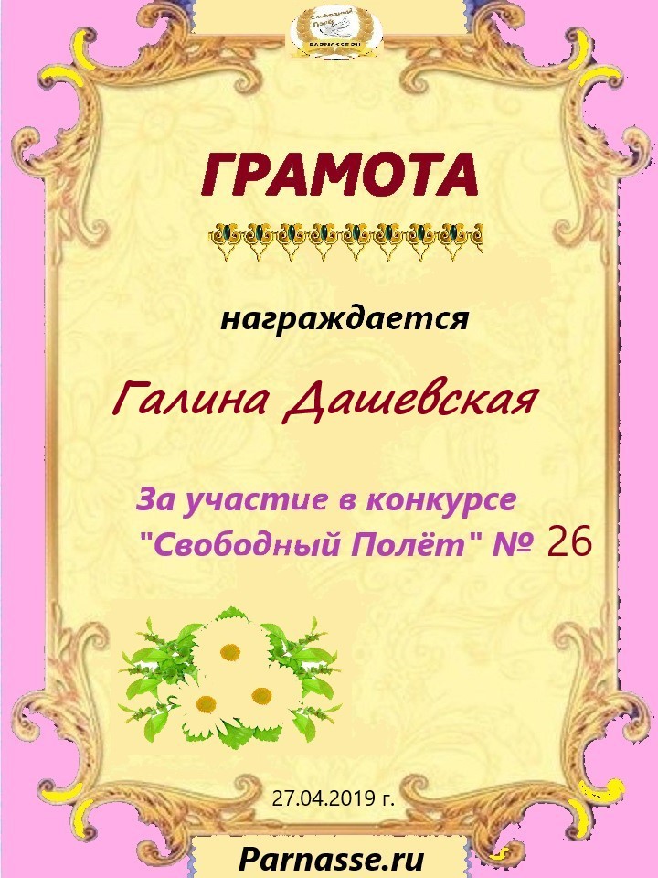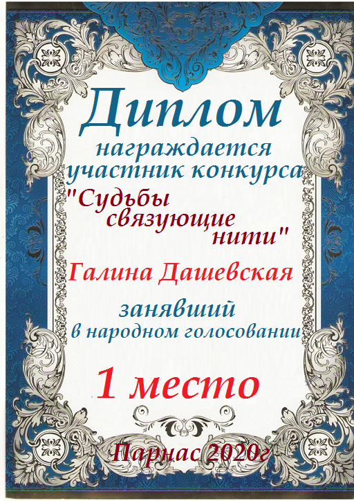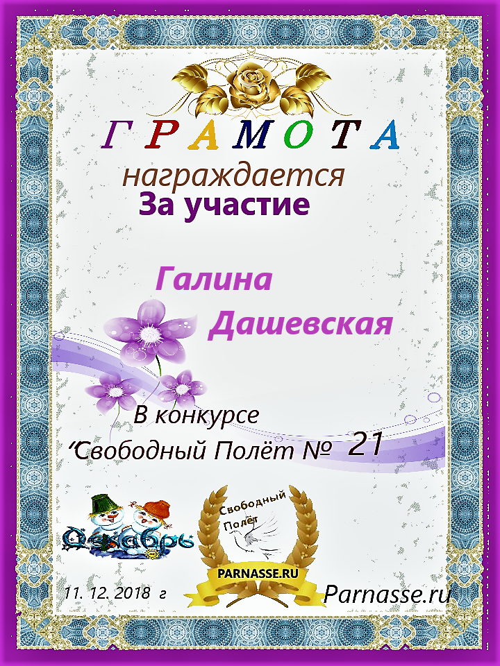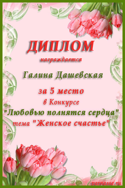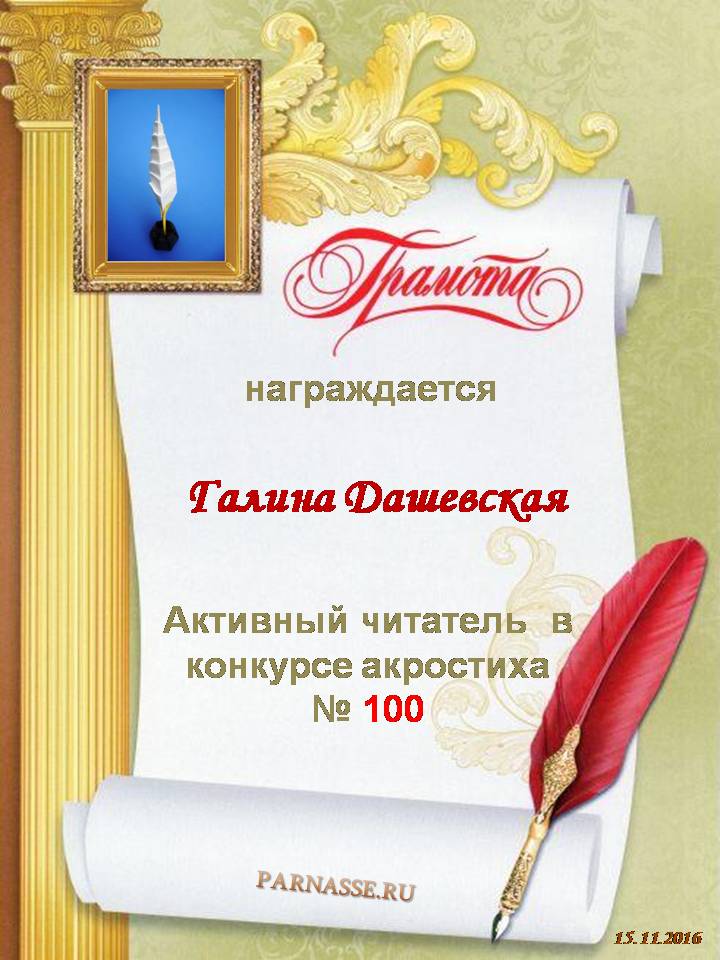 За неугасающую и неисчерпаемую творческую активность, постоянный контакт с Музой и признание сообществом "Парнасцев".От всей души желаем Вам, Галина, здоровья, любви, успехов, благополучия, удачи и творческого вдохновения!