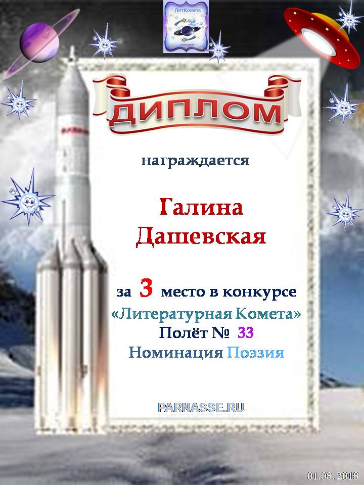 Поздравляю с занятым 3 местом в конкурсе “Литературная Комета – Полёт № 45» - Номинация Поэзия