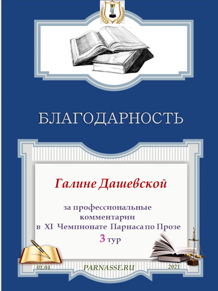 Номинация "Лучшее поздравление Парнасу в прозе".Искренне и от всего сердца благодарим Вас, ГАЛИНА, за участие в юбилейном конкурсе, за Ваши прекрасные, ярчайшие слова благодарности нашему порталу! Мы желаем Вам крепкого здоровья, жизнелюбия, творческой Музы и исполнения самых заветных желаний, которые только у Вас есть!