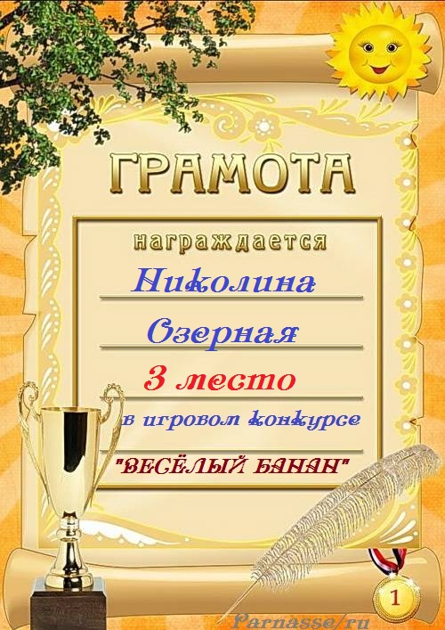 Третье место в ЛитКонкурсе "Улыбка августа", в поэтической номинации "Жара поэту не помеха". Судейское голосование. Поздравляем! Спасибо за активное участие! Ждем Ваши великолепные, замечательные стихи на новых конкурсах Парнаса. Творческого долголетия Вам и всех благ!
