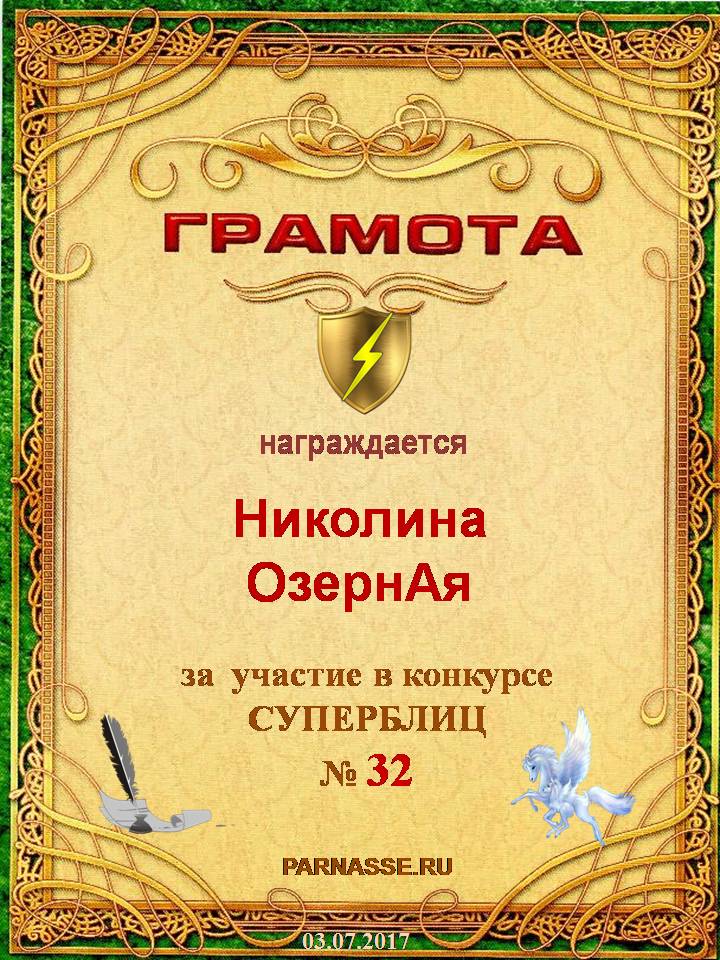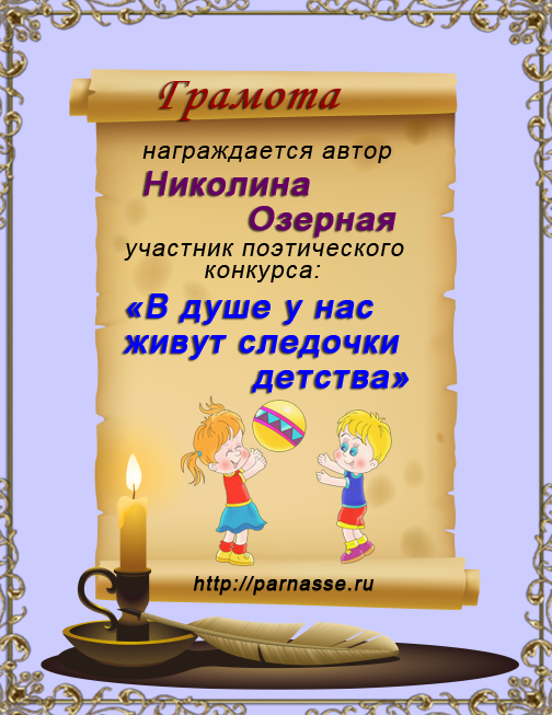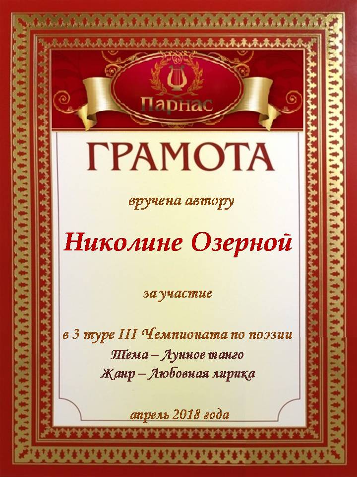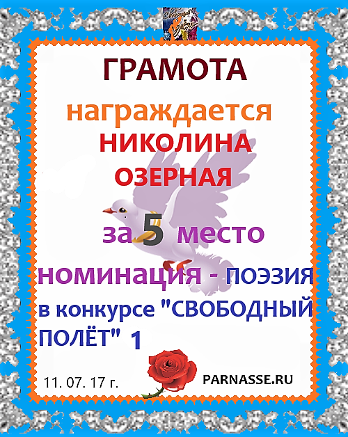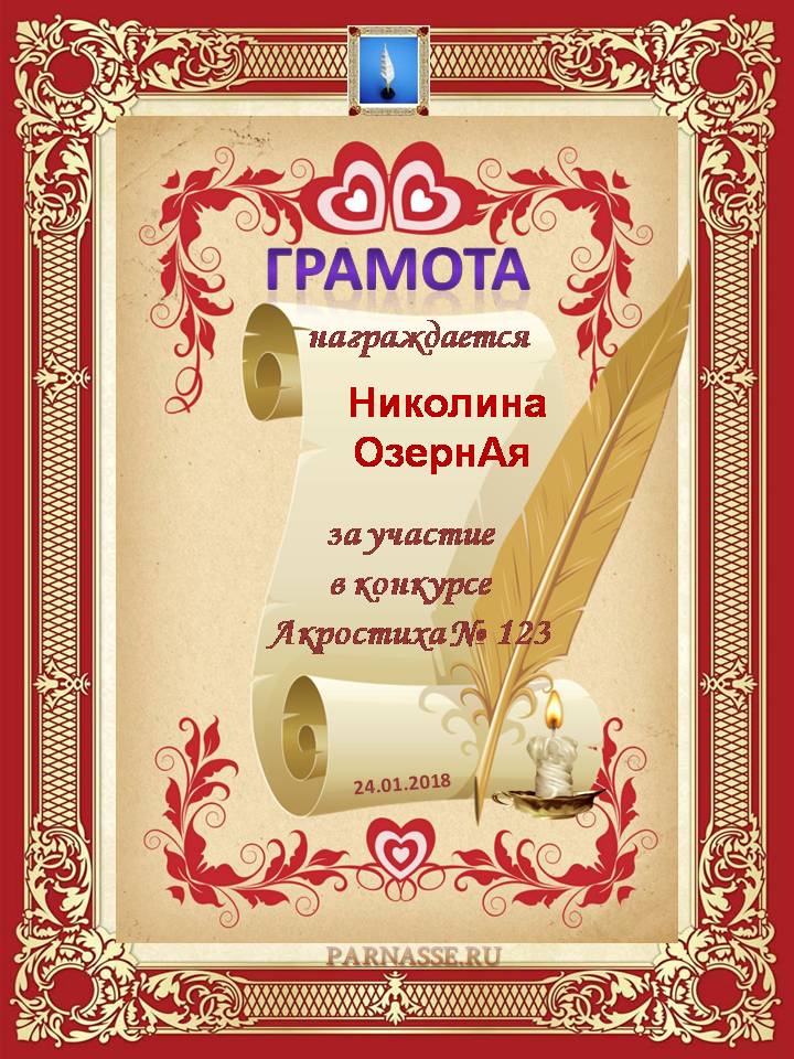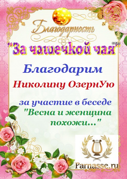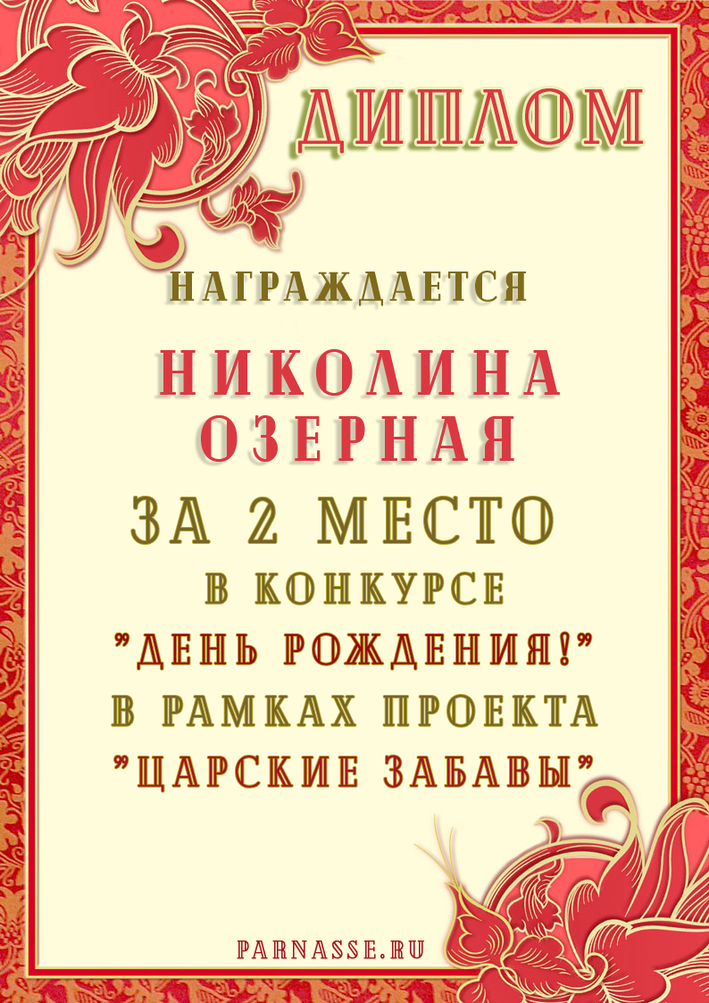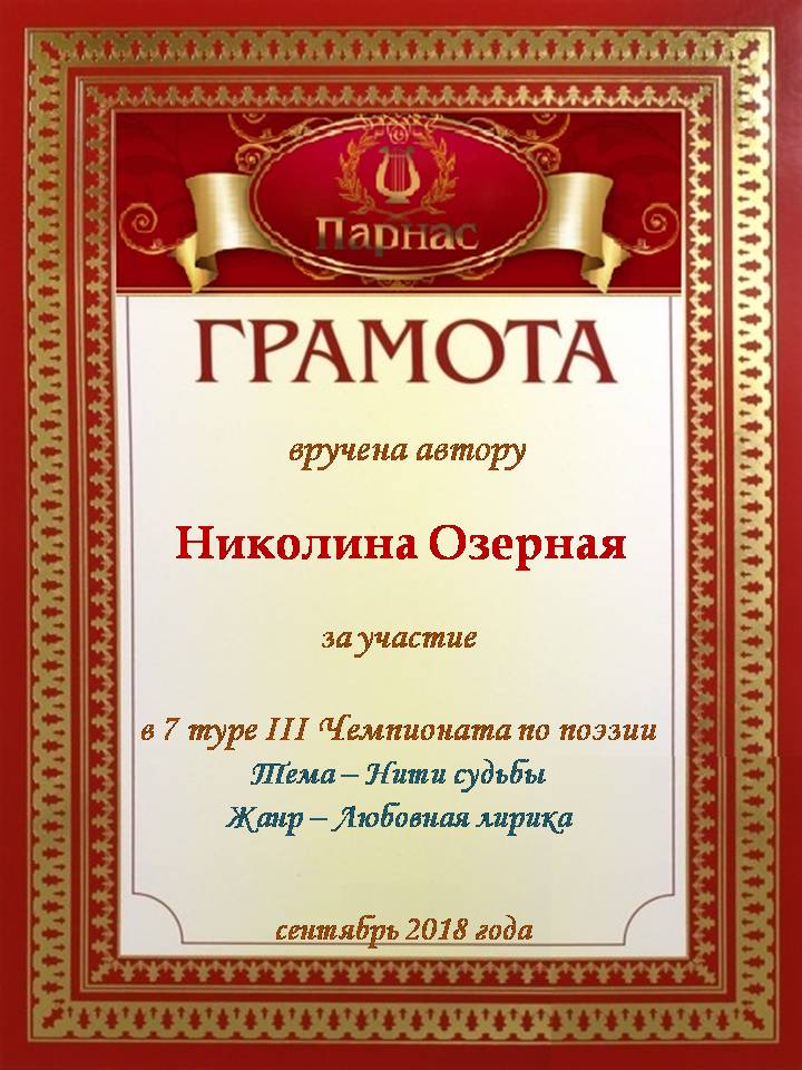 За неугасающую и неисчерпаемую творческую активность, постоянный контакт с Музой и признание сообществом "Парнасцев".От всей души желаем Вам, Николина, здоровья, любви, успехов, благополучия, удачи и творческого вдохновения!