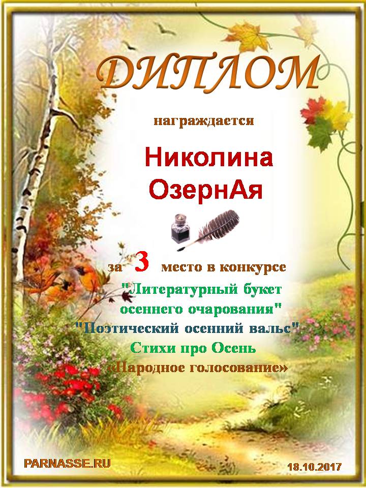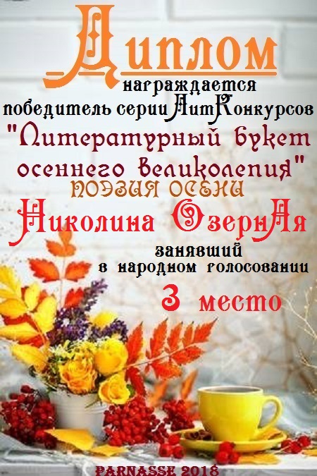 Третье место в серии ЛитКонкурсов "Литературный букет осеннего великолепия", в поэтической номинации "ПОЭЗИЯ ОСЕНИ", народное голосование. Поздравляем с прекрасной победой!