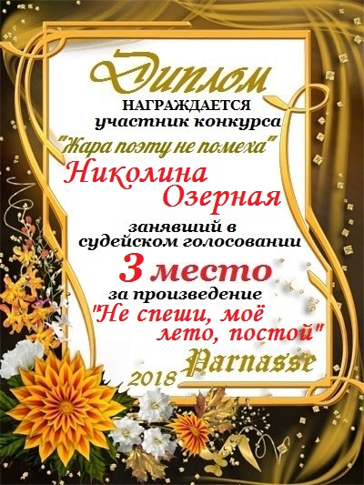 Третье место в серии летних литконкурсов "Лето красное, весёлое, прекрасное", в поэтической номинации "Жара поэту не помеха". Народное голосование. Поздравляем с победой!